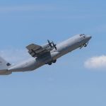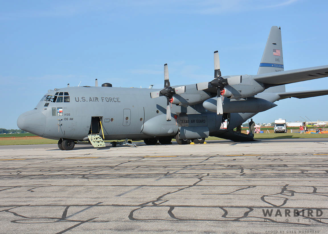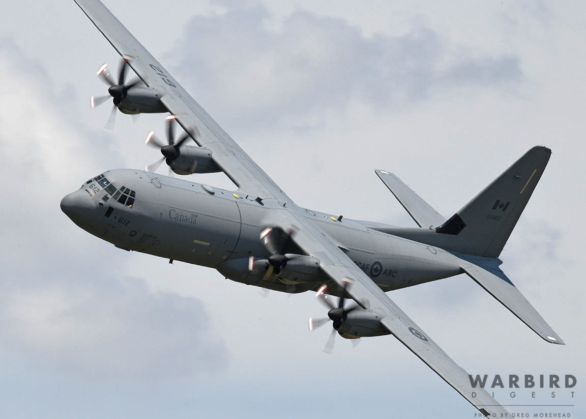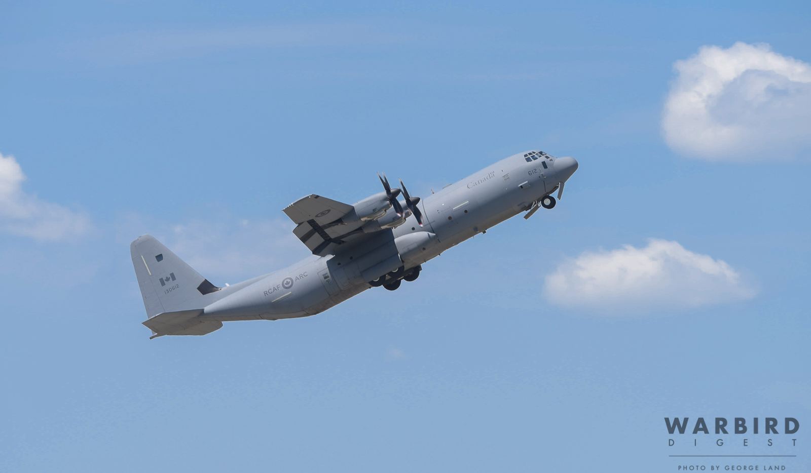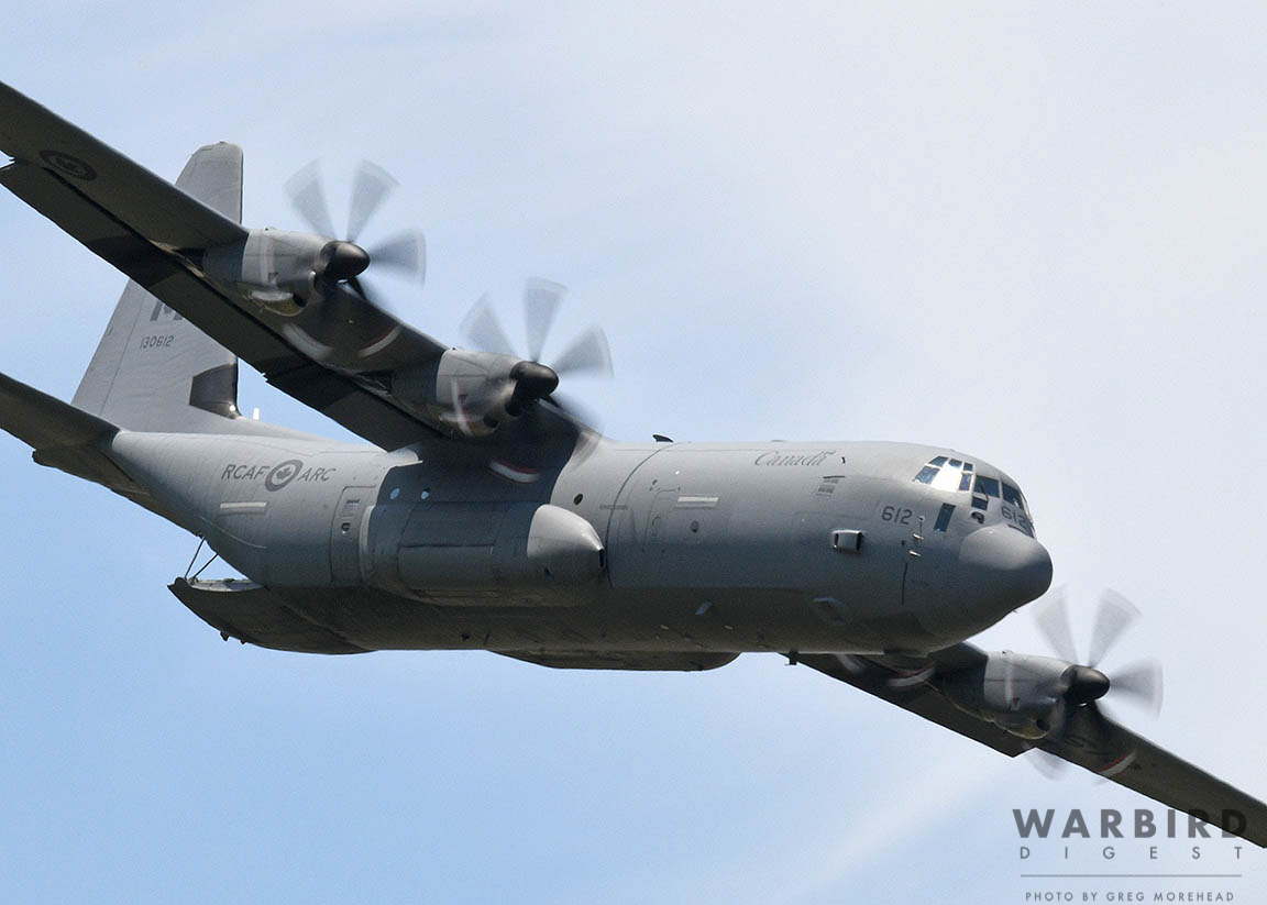 A Royal Canadian Air Force CC-130J-30 Hercules (s/n 130612) based with 436 Transport Squadron at RCAF Base Trenton makes an impressive climbout during takeoff at Thunder Over Michigan. (photo by George Land)