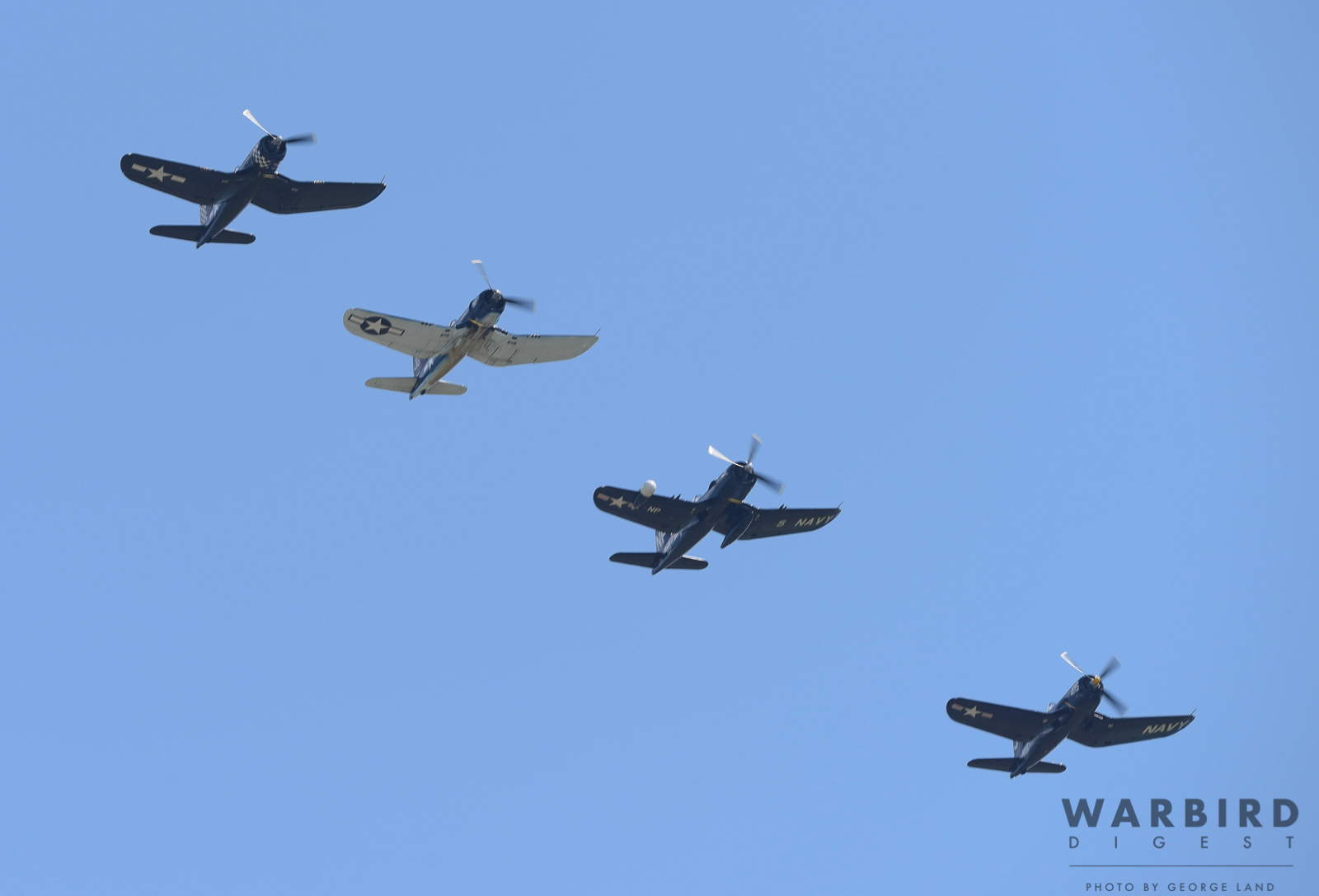 All eleven Corsairs got up for a formation flight. Here is a flight of four featuring the CAF’s FG-1D Bu.92468, Ellenville LLC’s FG-1D Bu.67089 Godspeed, the Collings Foundation’s F4U-5NL Bu.122179 and Jim Tobul’s F4U-4 Bu.97143 Korean War Hero. (photo by George Land)