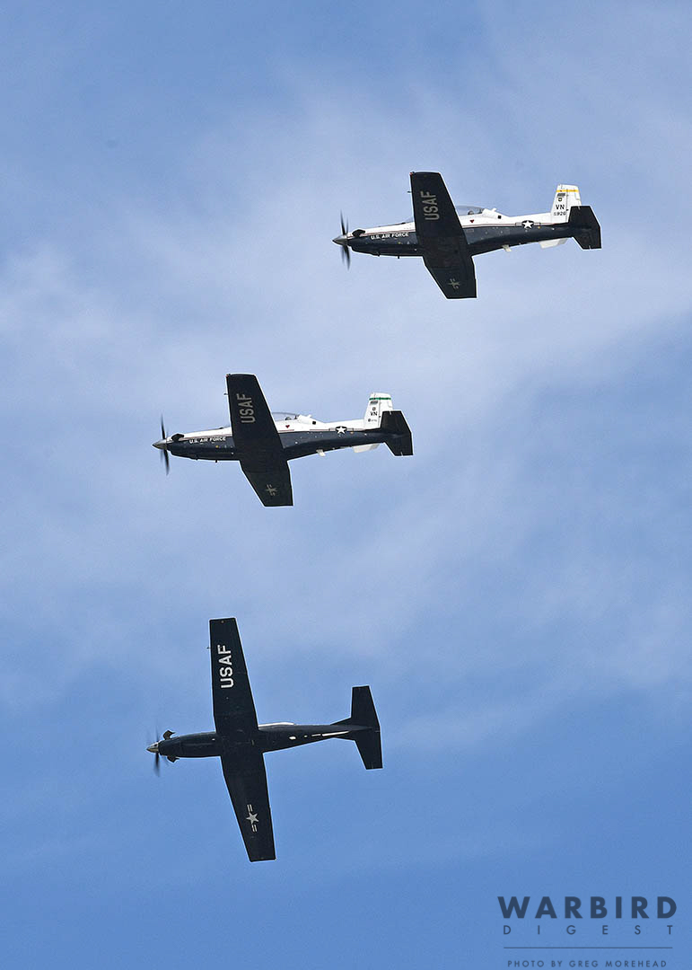 A nice shot of the Erickson Aircraft Museum’s F4U-7 with a brace of F4U-5s beyond to her right and Jim Tobul’s F4U-4 to the left. (photo by Greg Morehead)