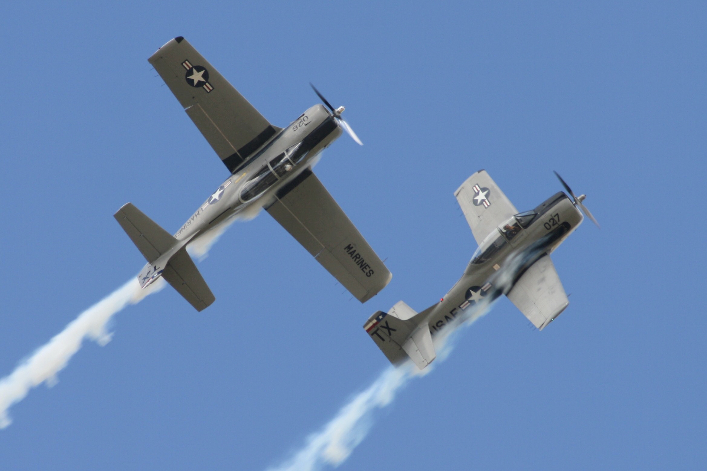 The two ship team is piloted by highly decorated combat veteran pilots performing thrilling precision, close-formation, aerobatic routines demonstrating the cutting edge performance of the T-28 Trojan warbird, and the flying expertise acquired in formal military training. Their show is unique in the air show industry. The Trojan Phlyers are as exciting as a jet team with their high speed action, and the roar of the big engines. They provide the smoke, the thunder, and the excitement as they fly their historic T-28 aircraft rich in military history in an exceptional and awe-inspiring display.