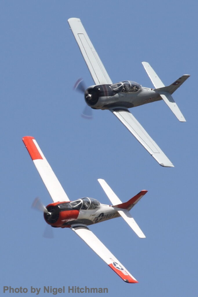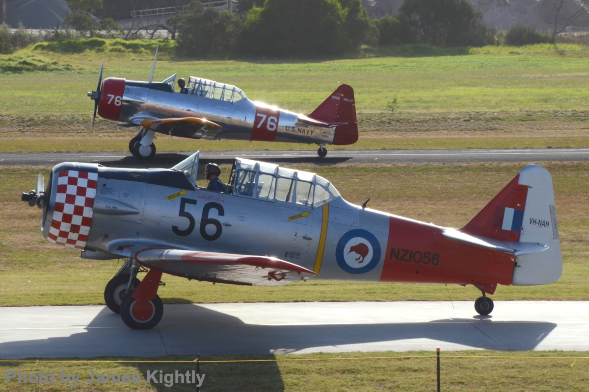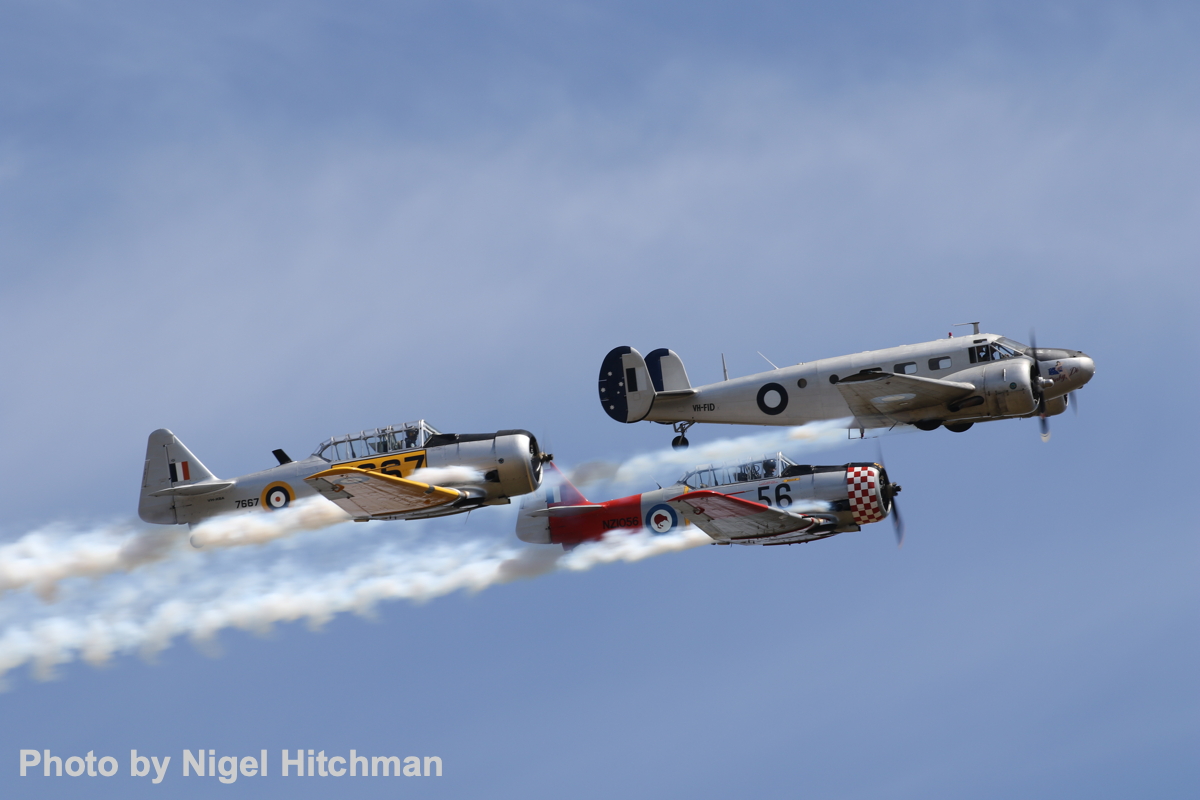 First vintage act as a three-ship Southern Knights Harvard display, retaining their usual standard with Harvards in RNZAF and SAAF colors, and a third in a SNJ scheme. Two Harvards flew again to escort Doug Hamilton and Steve Bekker in Doug’s Beech 18 in a fictitious South East Asia RAAF scheme. A two-ship NAA T-28 Trojan display was flown by Paul Bennet in Judy Pay’s VH-NAW with Steve Death in Mike Murphy’s VH-CIA.