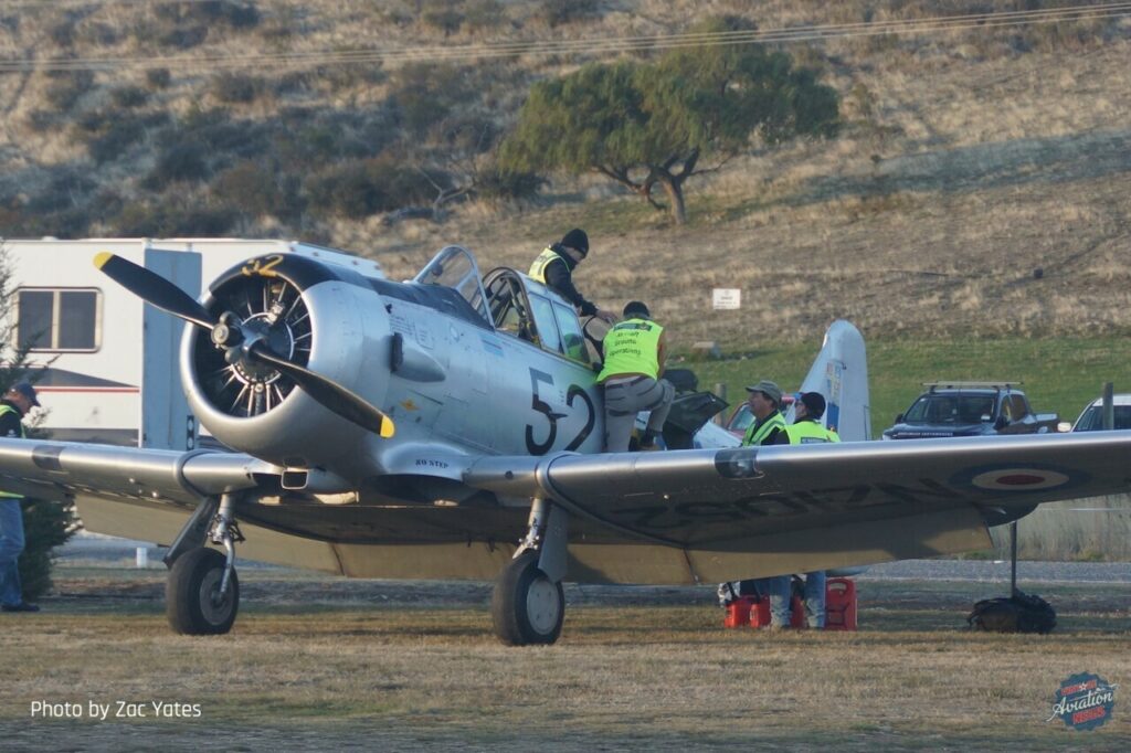 The flying program ran from 10am until 4.30pm on each of the two show days and was too full to go into detail in this report — we’ve not mentioned the elegant ASH-21 glider display flown by Dougie Hamilton; the two BAC Strikemasters (one ex-RNZAF and one formerly of the Royal Saudi Air Force) which flew together in an excellent routine; the USAF C-17 Globemaster III which flew from Hawaii to participate; the pair of North American T-28s that flew formation aerobatics; or even the showstopping mock attack where the “bad guy” Harvards bombed and strafed the field while the fighters scrambled to defend it.