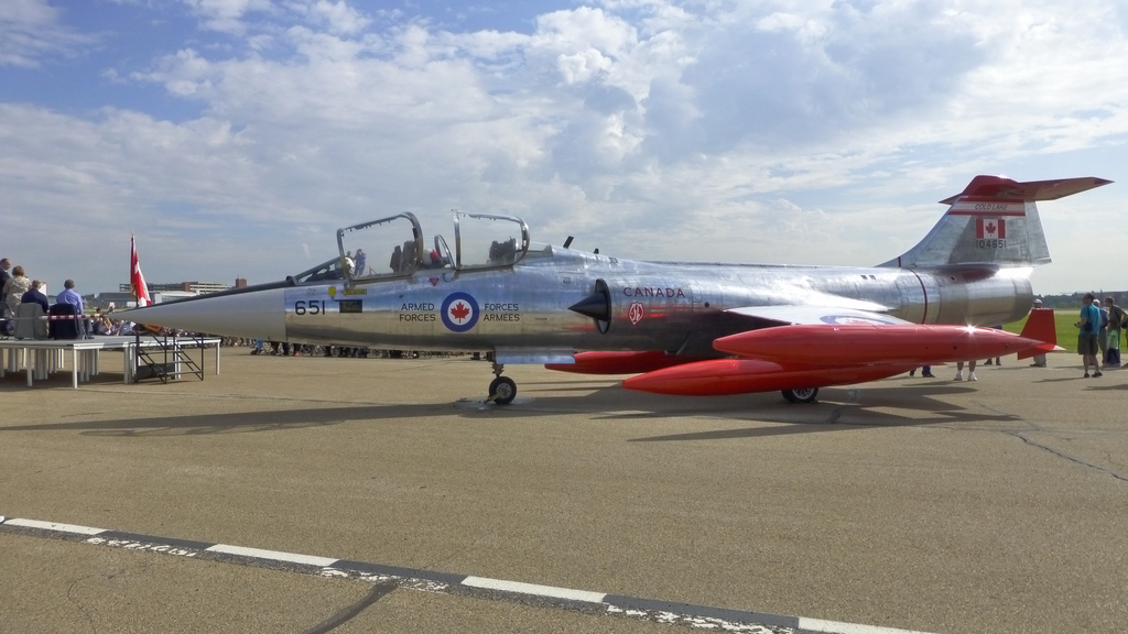 The plane that the restoration honors by reproduction is Canadian Armed Forces Starfighter 104651 which was stationed at Cold Lake, Alberta when it met its end in 1980. The plane was flying at a low altitude on a simulated missile site attack, when at 540 knots (+/- 621 MPH) its engine ingested several large birds. While her pilot Rick Wall attempted to save the plane, it became immediately apparent that the plane was doomed, so he and his copilot ejected to safety and “651” crashed.