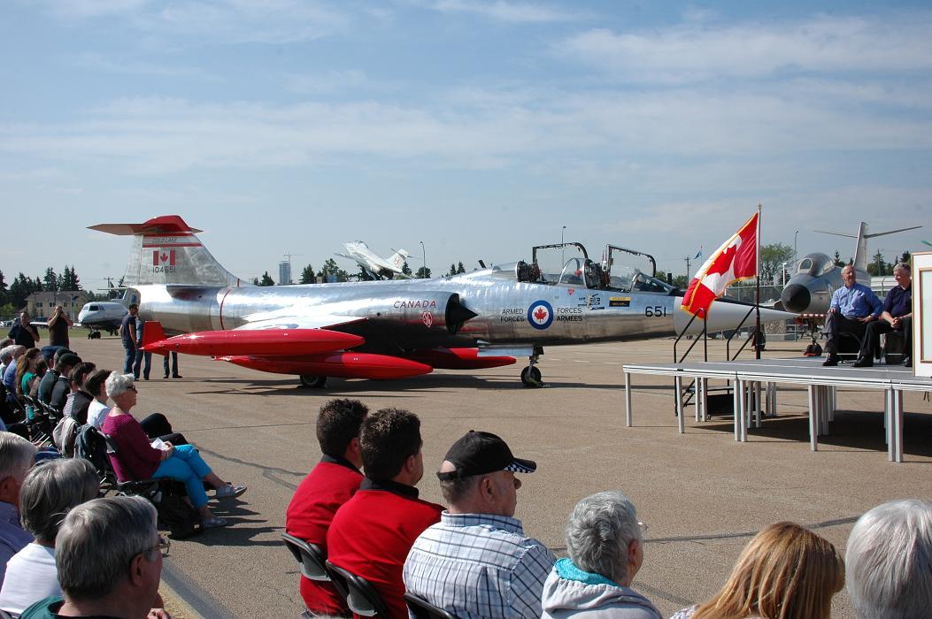 At the ceremony held last Saturday, the museum unveiled the “new” 651, attended by a crowd of approximately 500, including Members of Parliment, Members of the Alberta Legislature, The Alberta Minister of Culture and the last pilot of the “real” 104651, Rick Wall. Under sunny skies the plane looked resplendent with her highly polished fuselage and “RCAF Red”-accented tanks and tips. Over 30 former Starfighter personnel, air crew, ground crew and civilian workers from North West Industries, the firm that upgraded RCAF Starfighters in the 70s and 80s, were also on hand to see the plane that is destined to become the star attraction of the Museum’s collection.