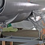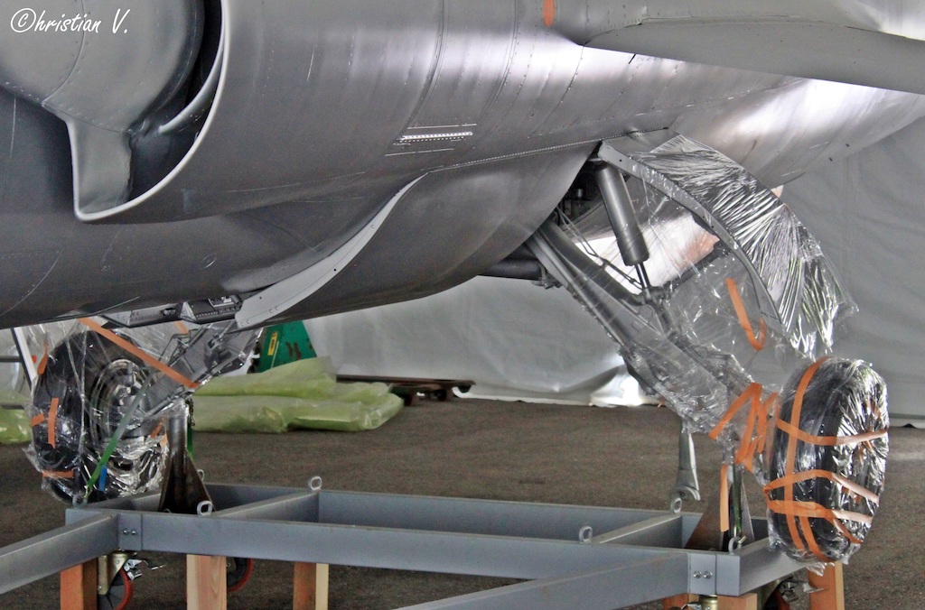 A closeup of the F-104’s main landing gear, which is presently covered in plastic sheeting… most likely to keep it from getting covered in paint during the markings respray. (photo by Christian Vaccari)