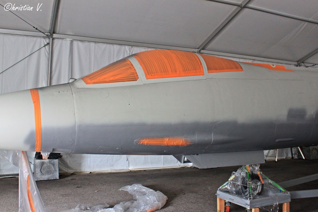The F-104’s cockpit glaring has been masked in orange tape, as has the cannon port… presumably to facilitate painting the fuselage. (photo by Christian Vaccari)