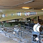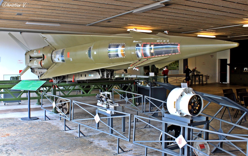 A Nike Hercules missile with parts of its skin cut away to show the internal components. Some of the missiles internal systems are on display in front of the rocket. (photo by Christian Vaccari)