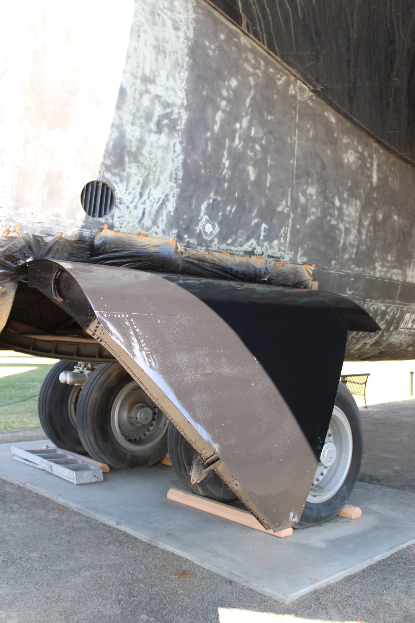 As the base itself was deactivated in 1995 following the end of the Cold War, the Castle Air Museum remained and expanded. However, being primarily an outdoor aviation museum, time and the elements always take a toll on the aircraft, requiring constant maintenance to be in display quality. Readers familiar with other articles focused on aircraft at the Castle Air Museum will be familiar with the work of Greg Stathatos, who has been a key figure in organizing the restoration of aircraft at Castle, as well as his work with the March Field Air Museum down in Riverside. Since January of 2025, Greg and other restoration volunteers at Castle have been hard at work sanding the old paint off the B-52 and preparing it to be repainted. This can be a challenging job for the volunteers, as not only does it require the use of a mobile lift platform, especially for work on the vertical stabilizer, but with the summer heat often going up to 90-100° F, work is often carried out in the morning, not only avoid the risk of overheating the volunteers, but also to allow the paint a better chance to set correctly.