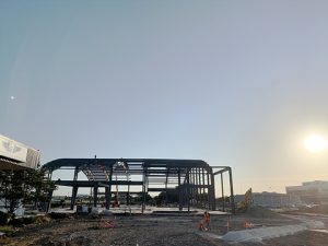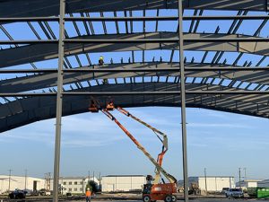 More than a year later a lot of progress has been made. Construction workers place major structural pieces on the CAF’s Henry B. Tippie National Aviation Education Center (NAEC) last week. Images now reflect the complete outline of the facility, which is scheduled to be completed by the end of December.