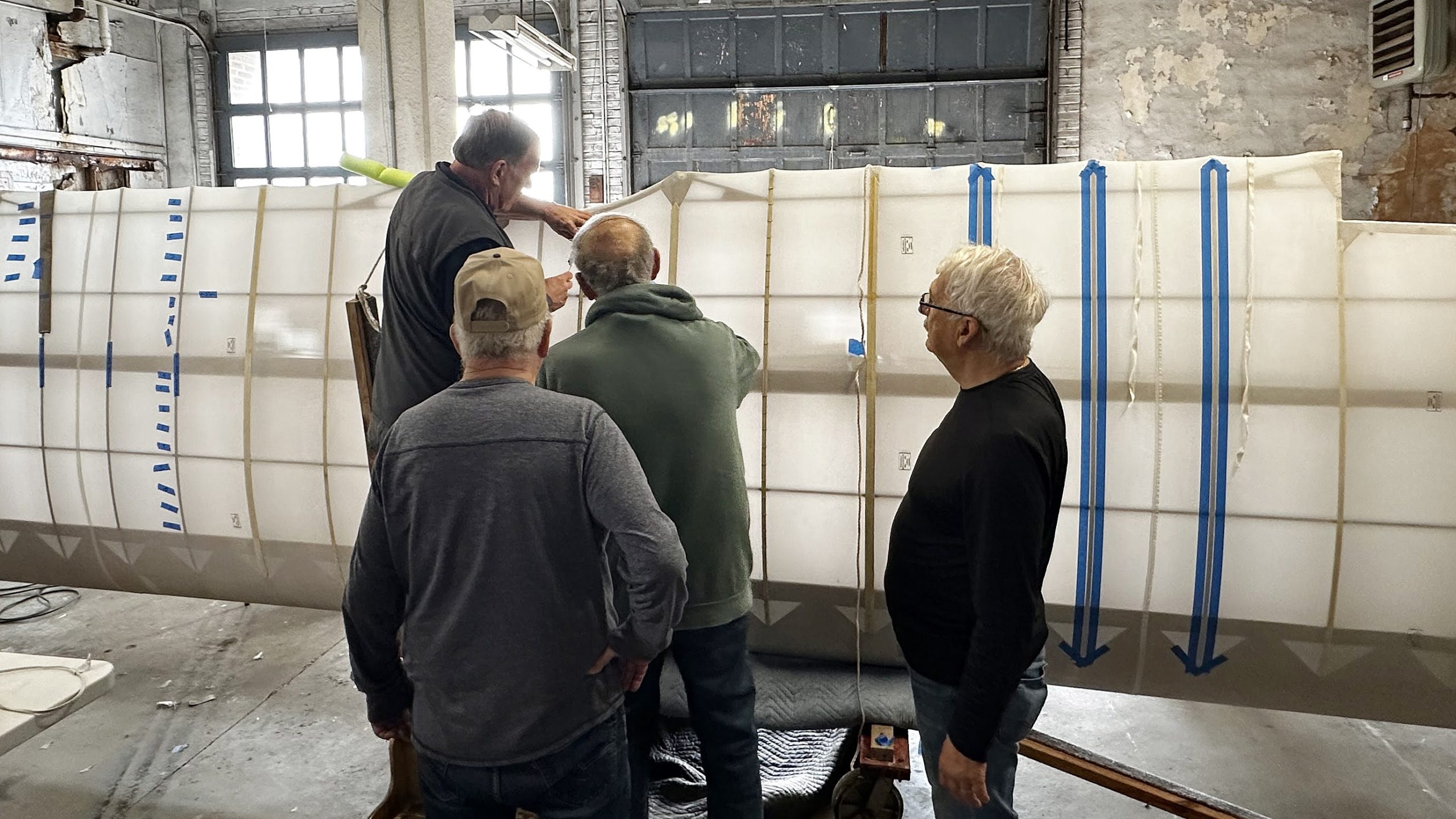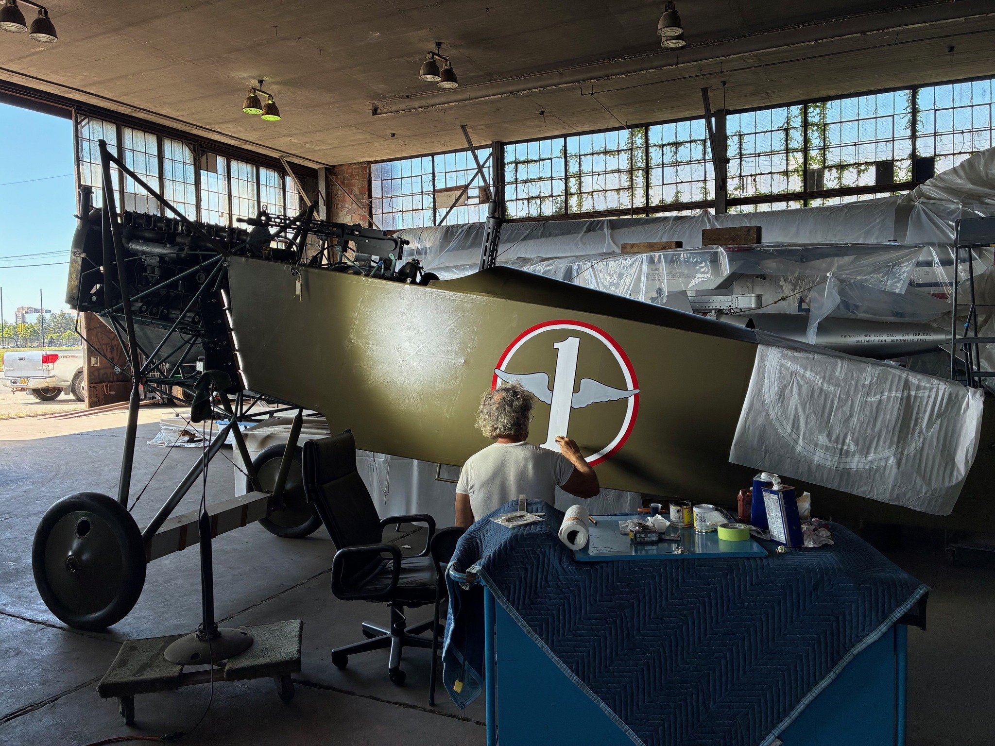 With the aircraft’s fabric surfaces covered in 2024, one of the main accomplishments of the Fokker D.VII project in 2025 has been the application of its paint scheme. The Cradle of Aviation Museum sits inside some of the surviving hangar from Mitchel Field/Mitchel Air Force Base, which was in operation from 1917 until 1961. Shortly its use in World War I as one of America’s largest flight training airfields, Mitchel Field was home to the 1st Aero Squadron (now the 1st Reconnaissance Squadron; the oldest U.S. military aviation unit still in service). Having flown in combat over France during World War I and later taking part in the Allied Occupation of the Rhineland, the squadron would fly captured Fokker D.VIIs over the Rhine River for evaluation flights and later flew these aircraft when they were reassigned to Mitchel Field. At least one of the Fokker D.VIIs at Mitchel Field had the emblem of the 1st Aero Squadron painted on the sides of its fuselage fabric between the cockpit and the tail surfaces of the aircraft.