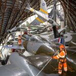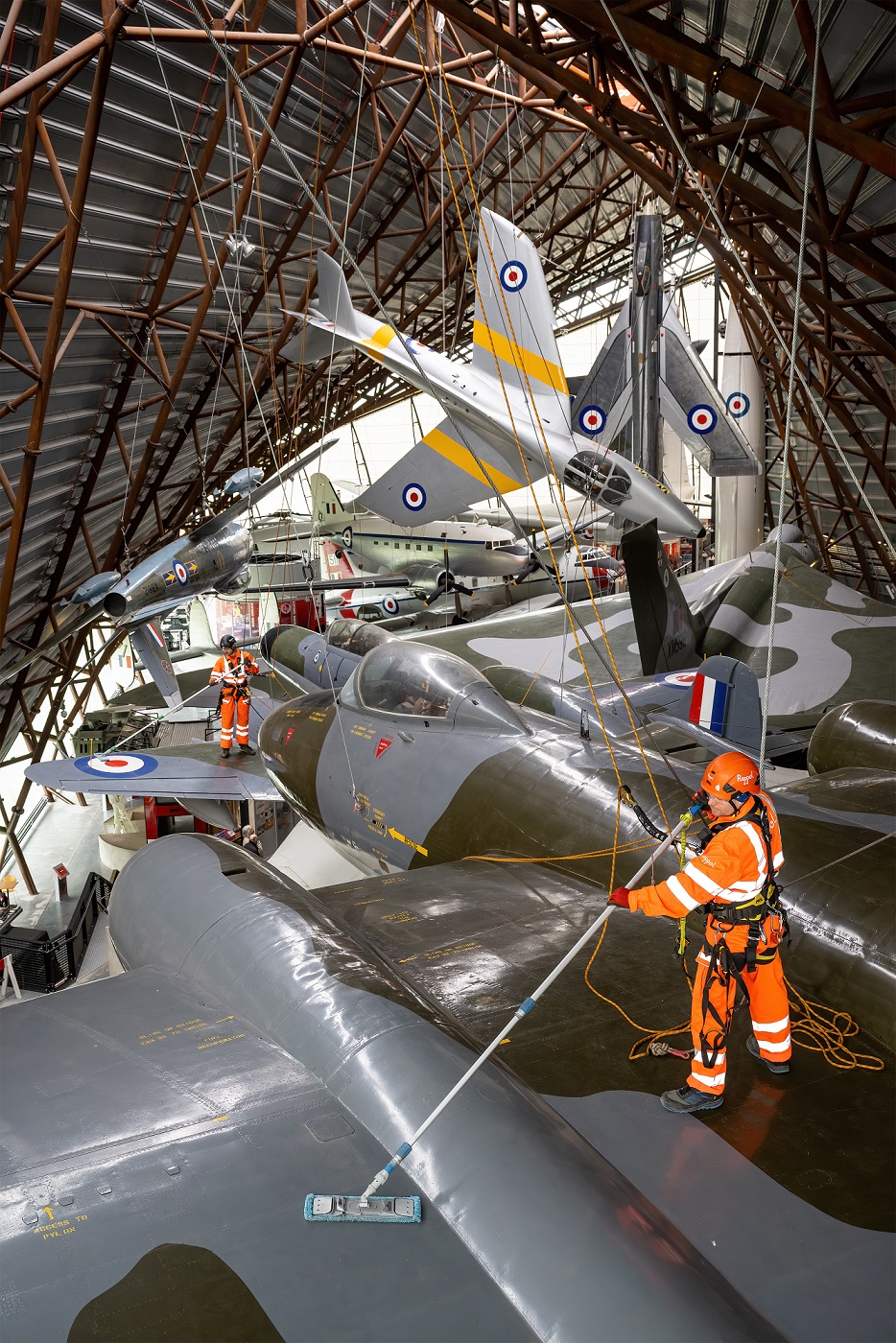 Strapped into harnesses, the specialist cleaning team climbs the rafters of the building and abseils down to access the aircraft. No cleaning solutions are used on the aircraft, just good dusting using large soft fiber mops. In addition to cleaning the aircraft, the team will also be inspecting the suspension cables supporting the aircraft in their flying display positions.