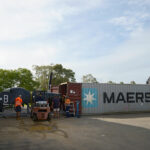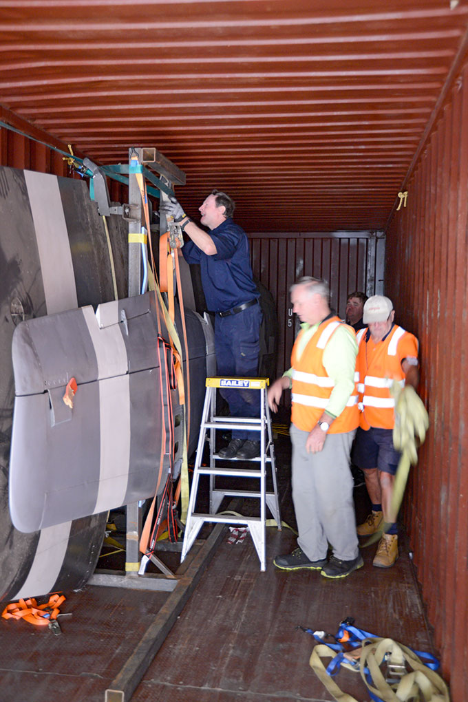 Ross Pay (left) and John Parker (from HFC) discussing the Mustang’s arrival in Scone NSW as the team begins carefully unpacking it from the shipping container. (image via Hunter Fighter Collection)