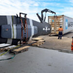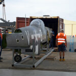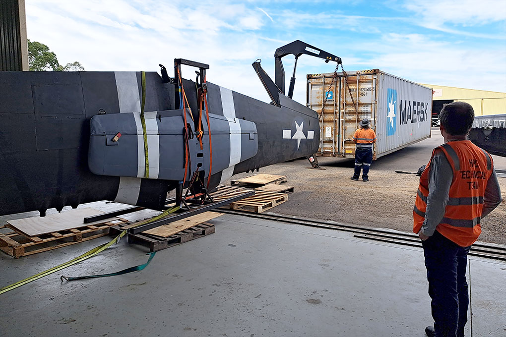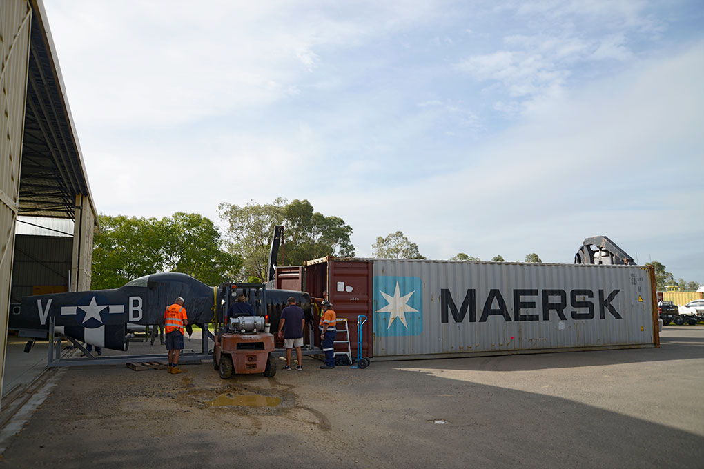 The Mustang’s fuselage emerges from its shipping container in Scone, NSW following a 20,000km journey from the UK by sea. (image via Hunter Fighter Collection)