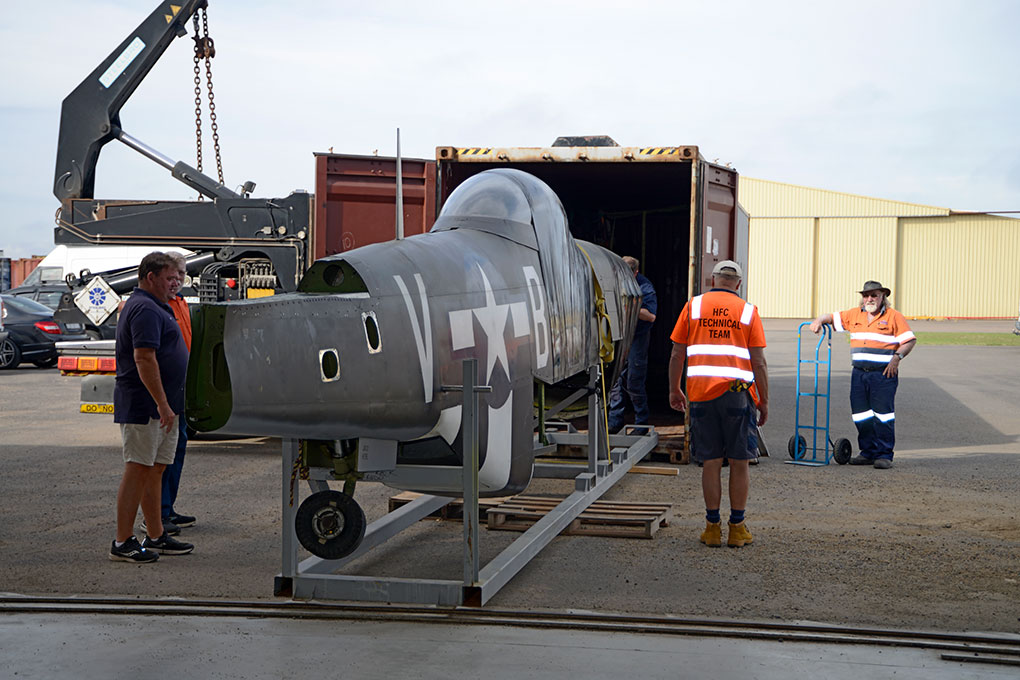 The Mustang is carefully unpacked from its shipping container in Scone. (image via Hunter Fighter Collection)