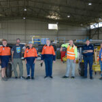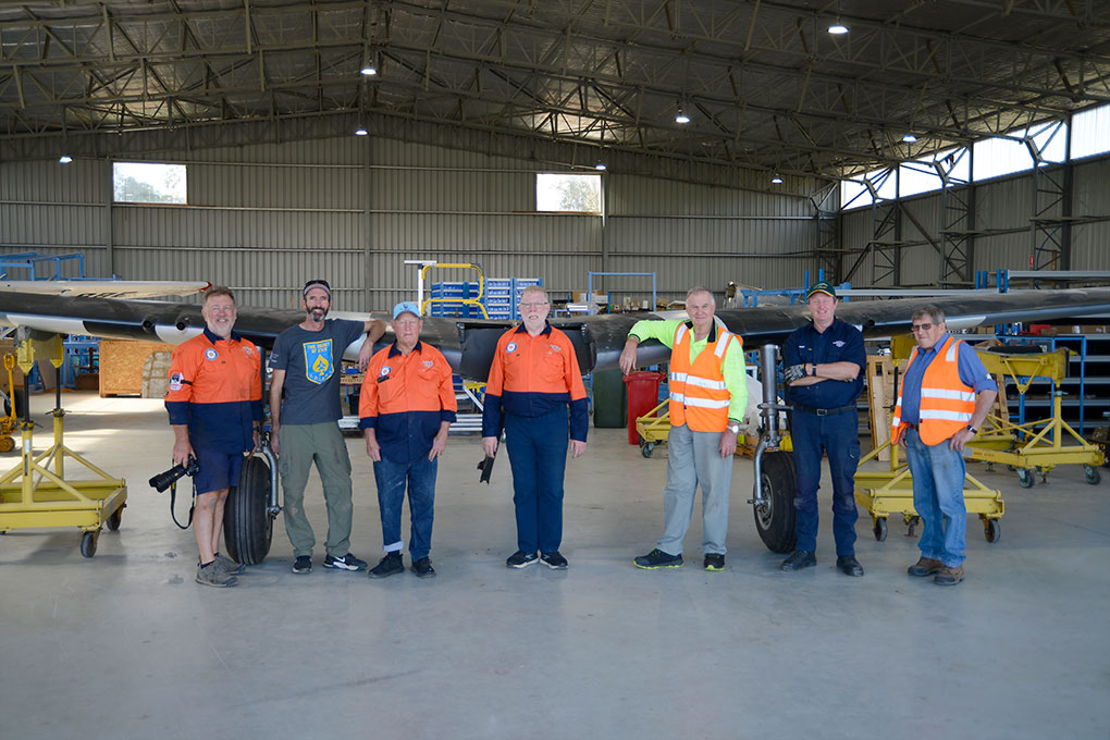 Some of the HFC Technical Team volunteers posing before the Mustang’s wings at the end of a successful first day since the aircraft’s arrival in Scone. (image via Hunter Fighter Collection)