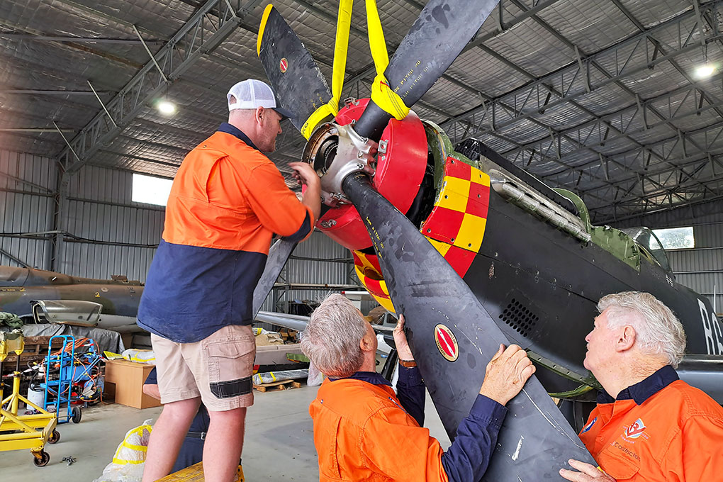 Re-mounting the Mustang’s propeller. (image via Hunter Fighter Collection)