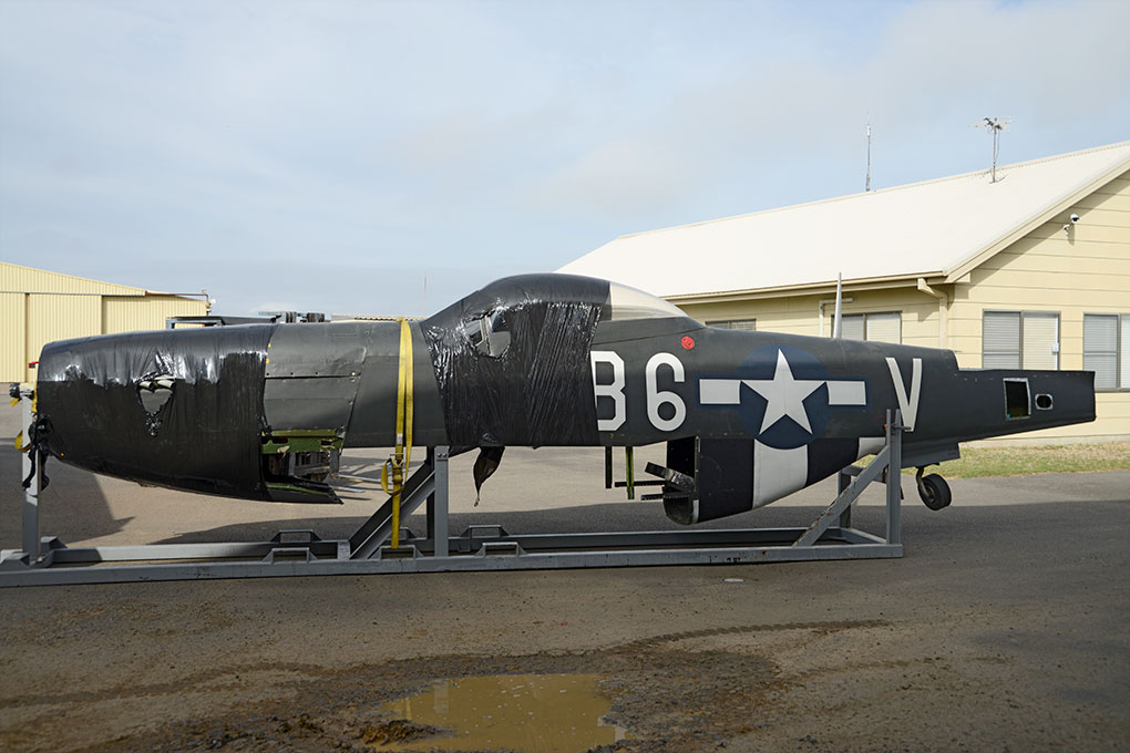 The partially re-assembled Mustang sitting outside the Hunter Fighter Collection’s hangar in Scone, NSW. (image via Hunter Fighter Collection)
