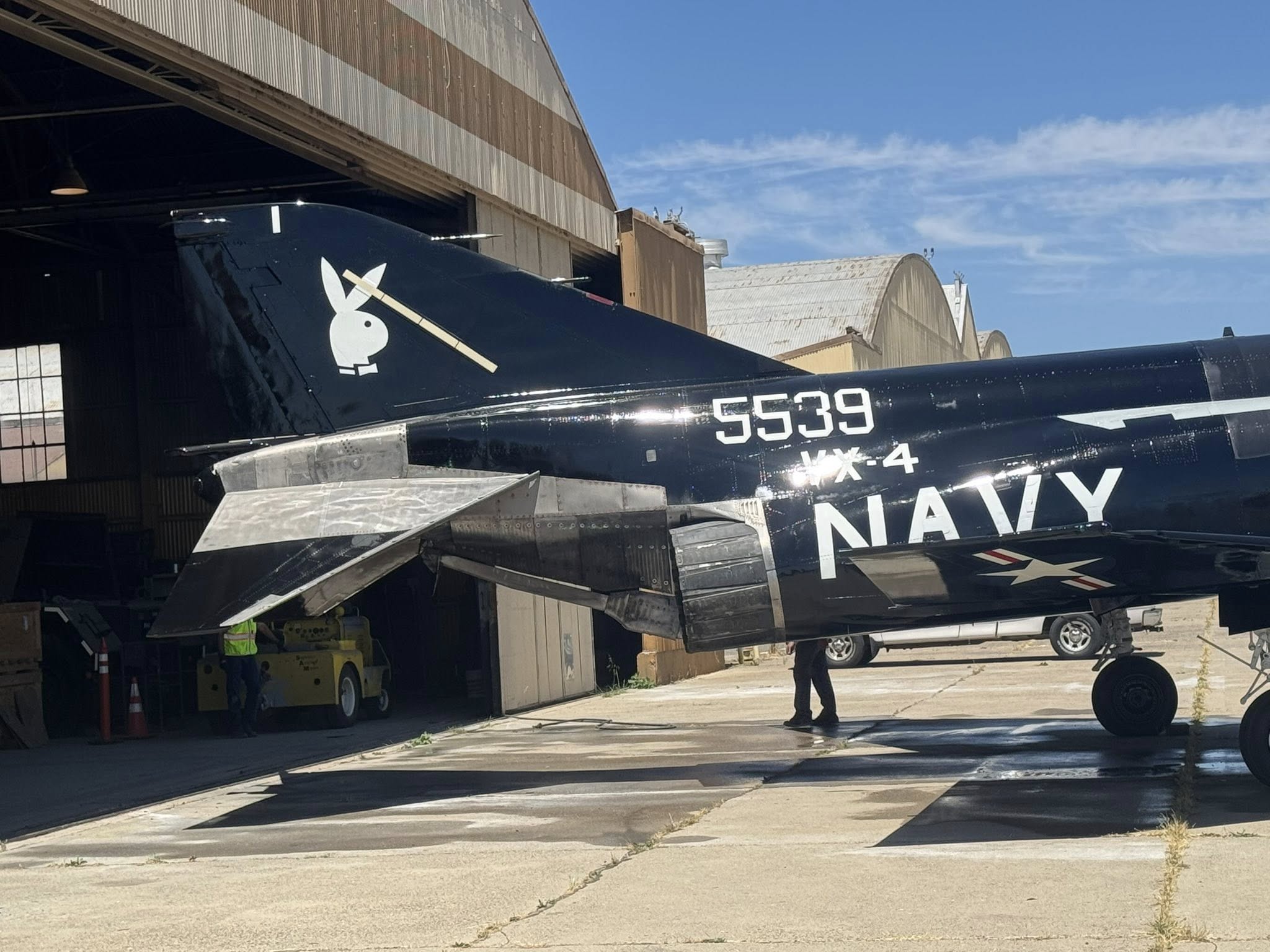 Tail of F-4S Phantom II BuNo 155539 “Black Bunny” being rolled out of the Castle Air Museum restoration hangar after nearly two years of work. (Castle Air Museum via Greg Stathatos)
