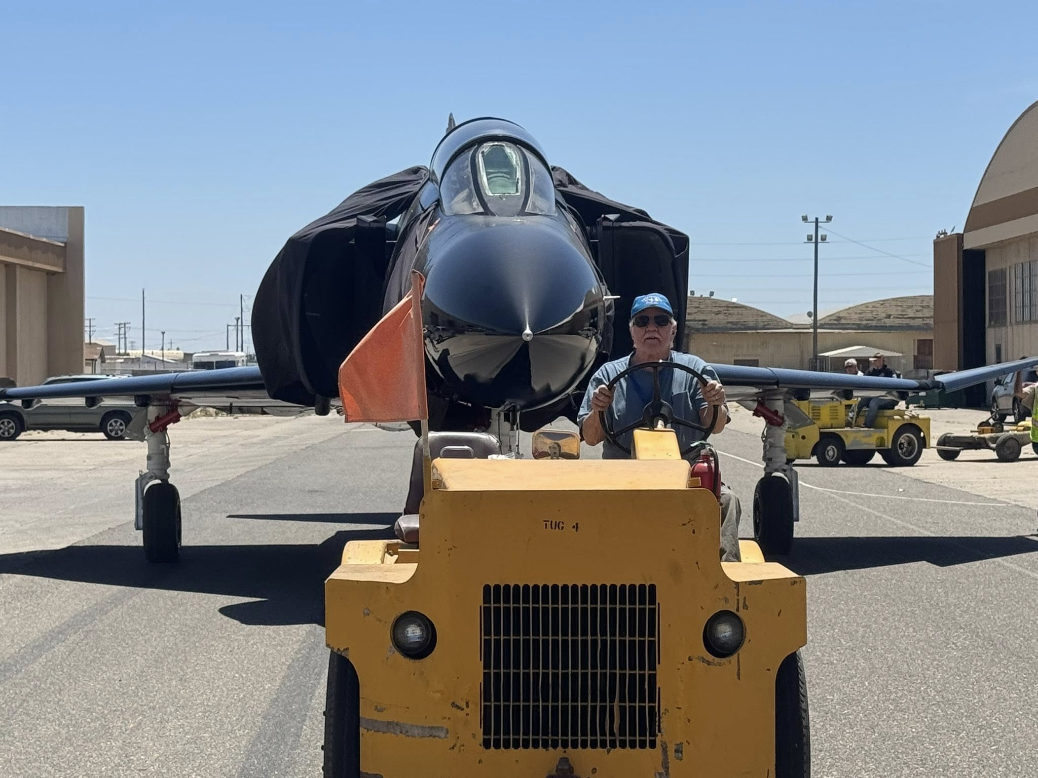 One of the Castle Air Museum volunteers towing the Black Bunny F-4S Phantom II from the restoration hangar at Castle-Merced Airport to the Castle Air Museum. (Castle Air Museum via Greg Stathatos)