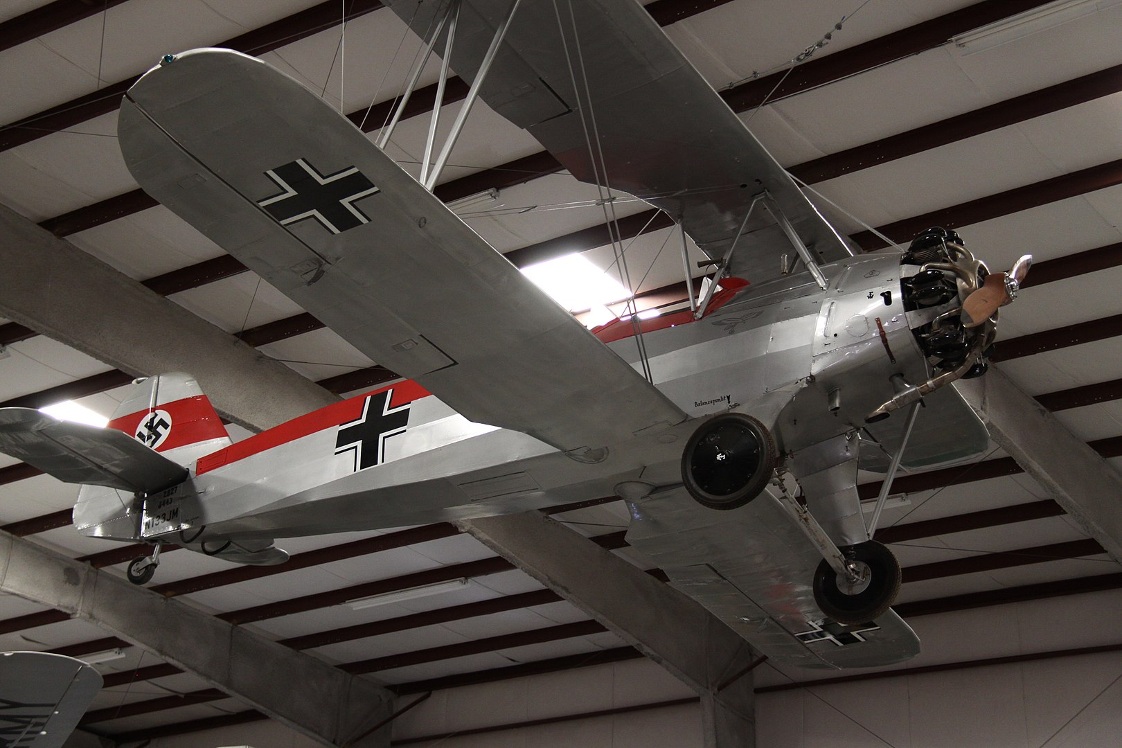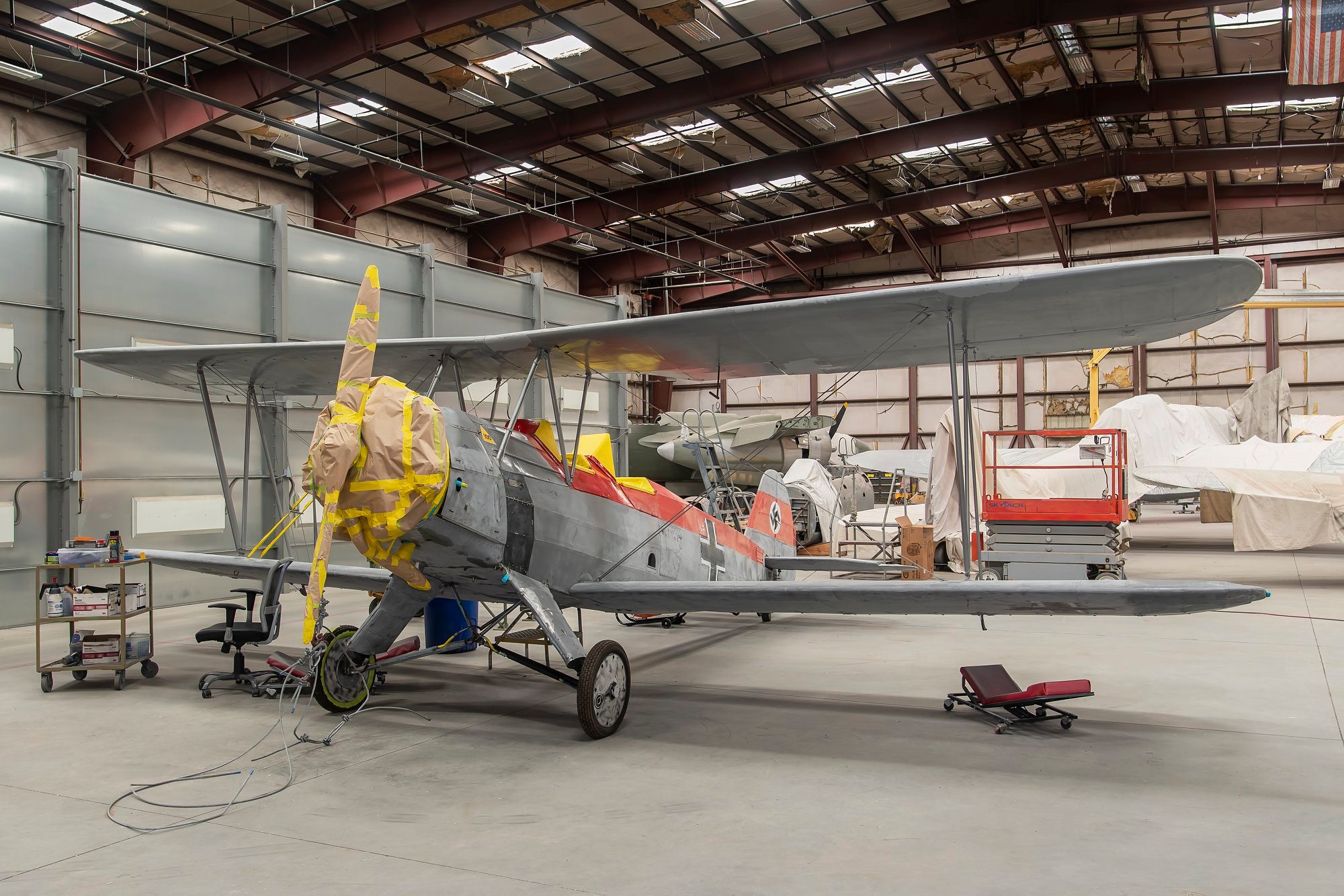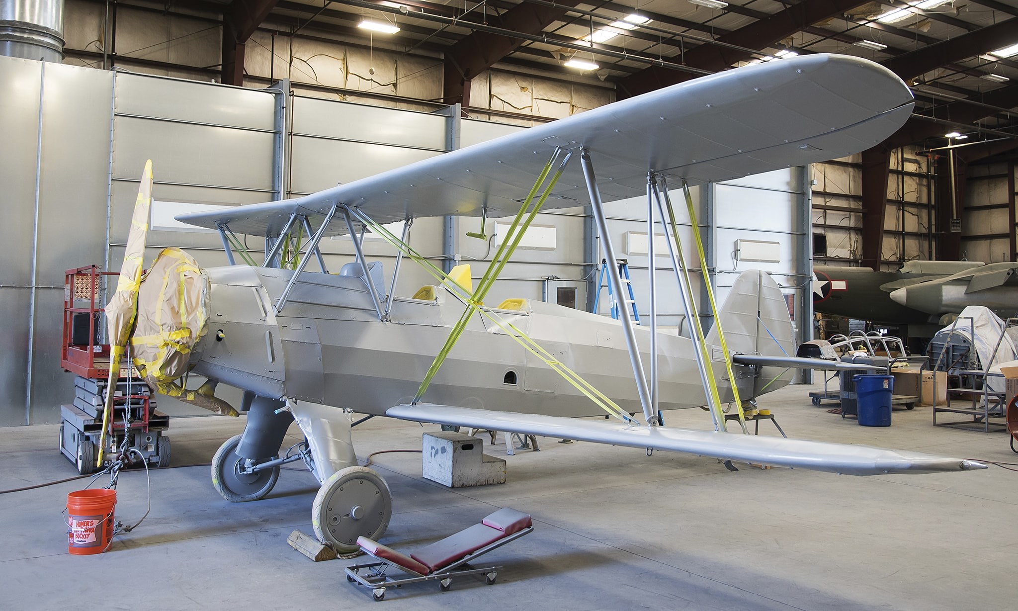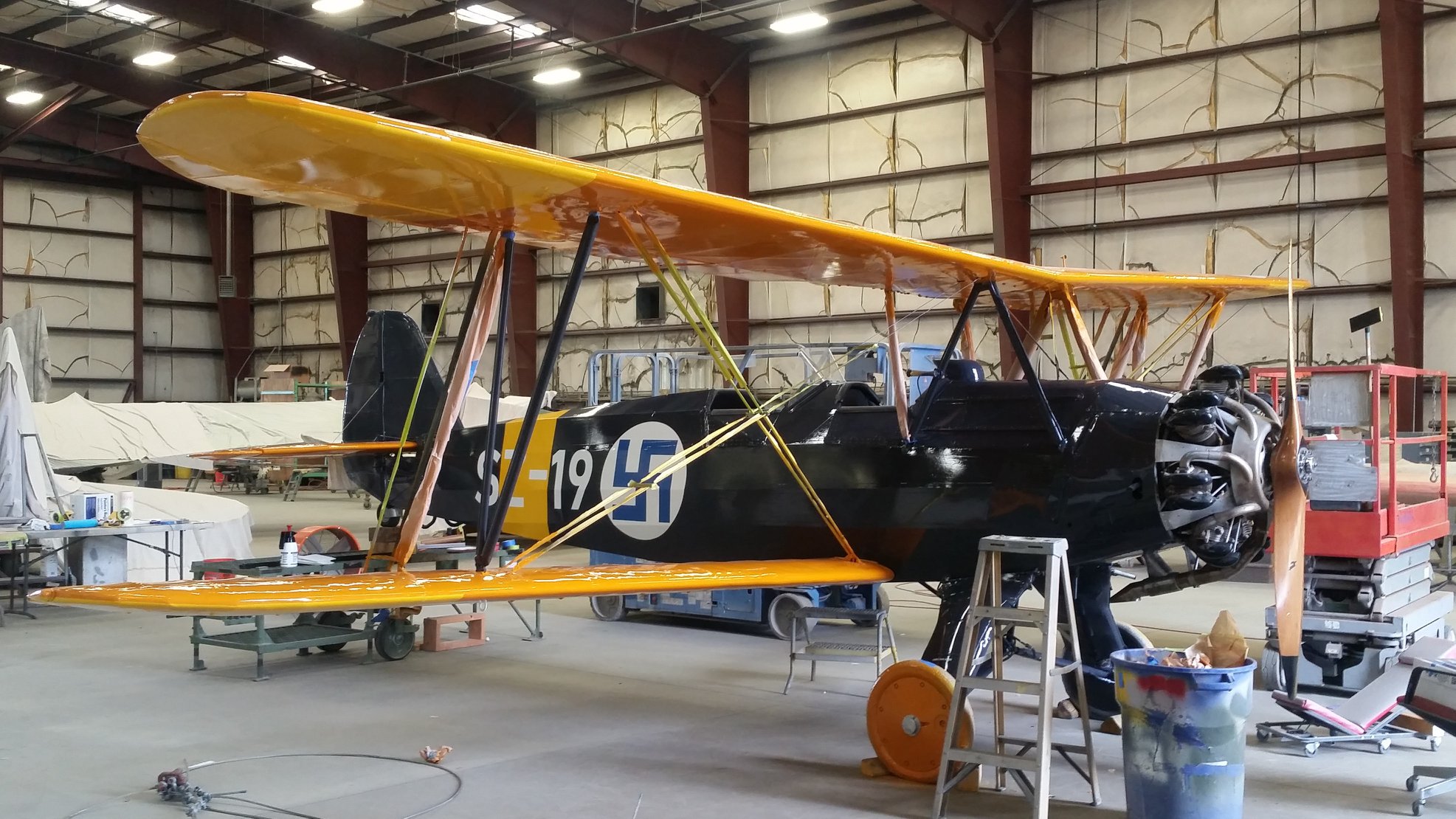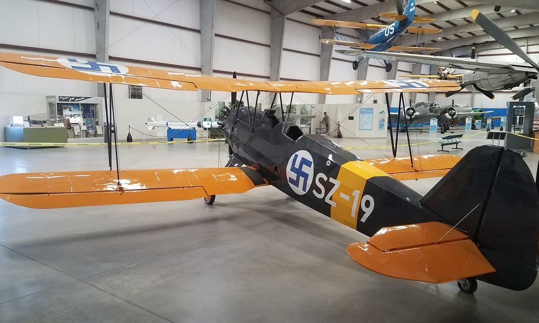 In about 1970, a gentleman in Tucson, Arizona imported the aircraft to the United States for restoration. She received the U.S. civil registration N133JM under the ownership of the Intercontinental Electric Corp in December, 1978, and flew again for the first time in 1982, wearing a mid-1930s Luftwaffe livery. The owners eventually donated the aircraft to the Pima Air & Space Museum in August, 1992. They displayed her, hanging from the roof, inside one of their hangars, and there she stayed until earlier this year. The museum has been incredibly active with the upkeep of the roughly 300 airframes in their collection, with a remarkable rate of restorations and refurbishments in recent years. They have been re-finishing aircraft regularly too, and updating paint schemes to reflect more accurate liveries. Such was the case with their Stieglitz, which the museum lowered from the roof in Hangar 3 a couple of months ago. The aircraft was in excellent condition, and did not need any repairs to her fabric, which they sanded, painted with primer and refinished with her original Finnish Air Force markings this November. Finally, after nearly 75 years, the Stieglitz wears her historically accurate paint scheme once more.