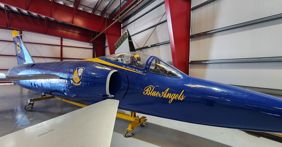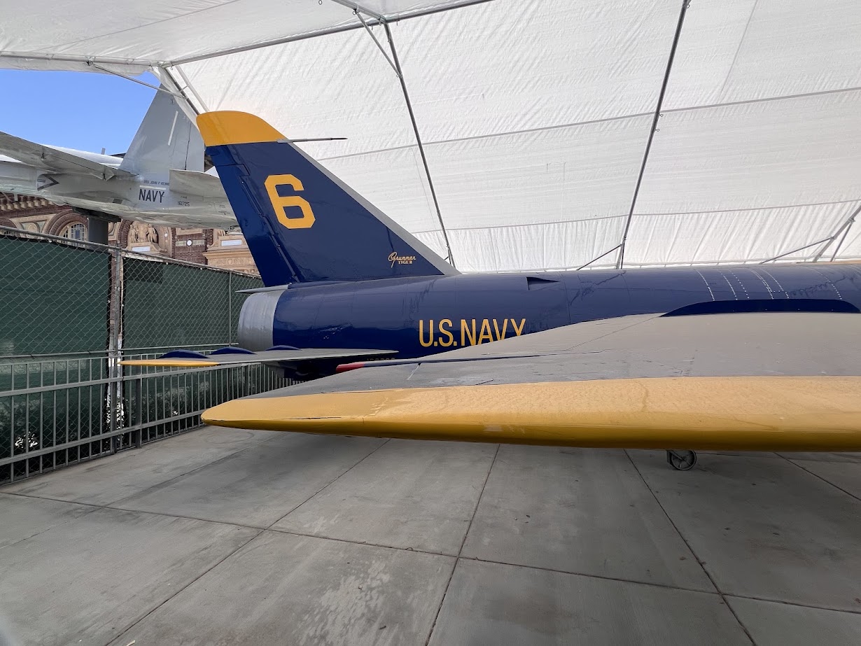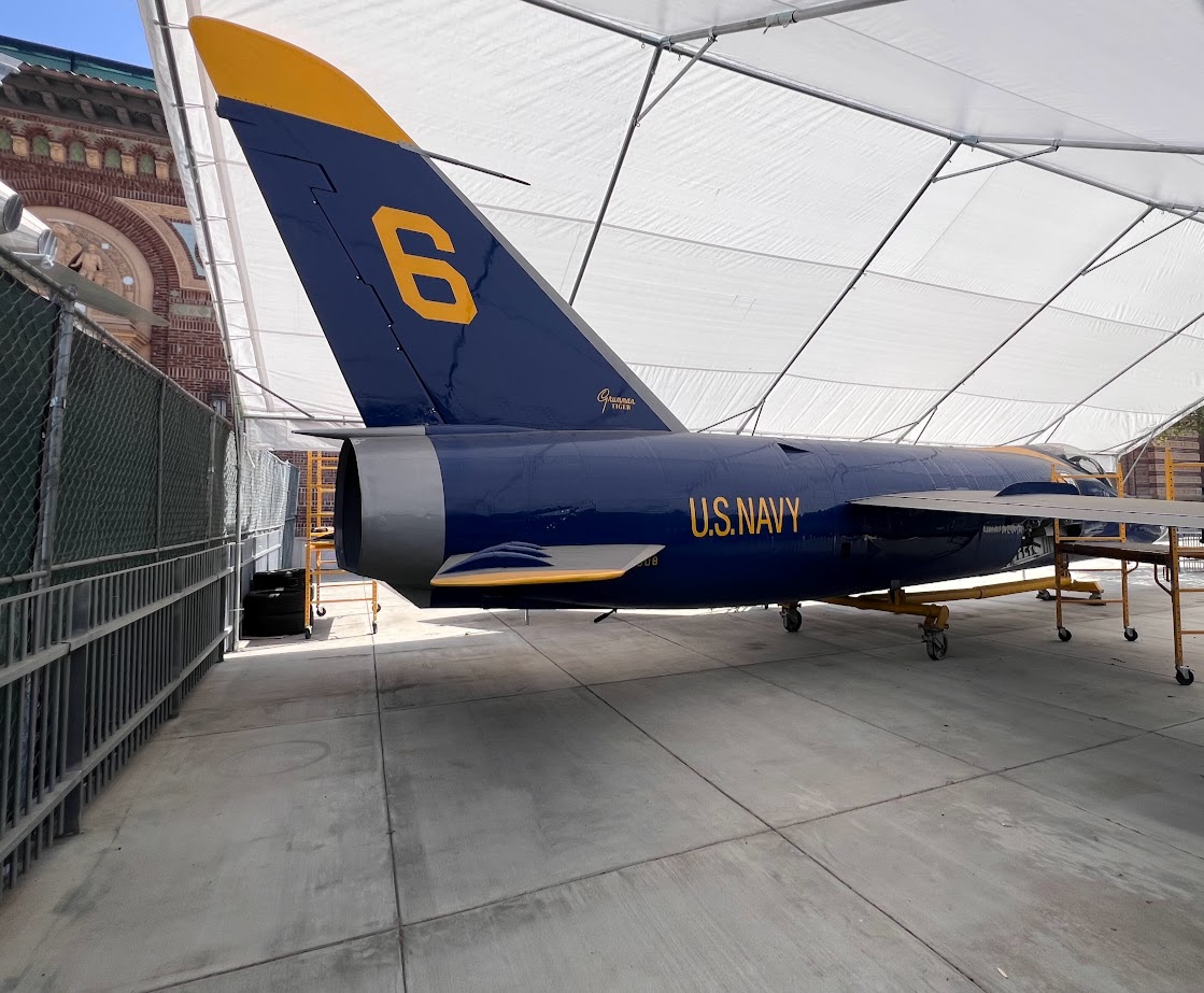 In March 2025, a Grumman F11F Tiger in the distinctive blue and yellow colors of the Blue Angels appeared at the California Science Center in Los Angeles’ Exposition Park. Unbeknownst to many visitors, the aircraft has had quite the journey to get to the California Science Center, where it will be displayed in the looming structure taking shape above it, the Samuel Oschin Air and Space Center.