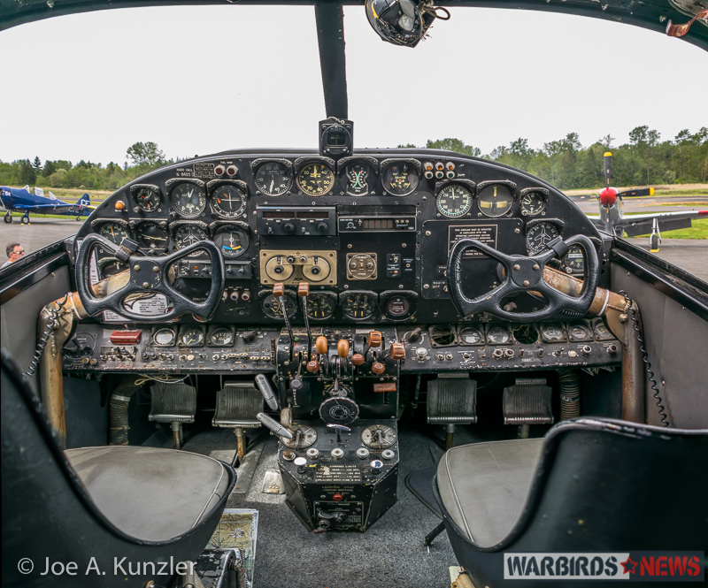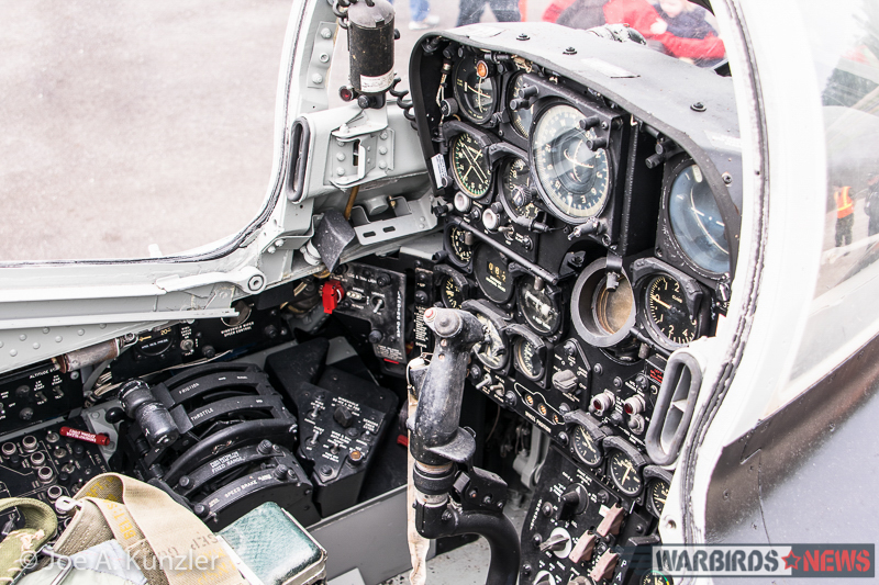 In recent years, the Heritage Flight Museum rescued a long-neglected Northrop F-89 Scorpion – 53-2453 – and restored her for static display. Thankfully, despite cloudy skies, the weather conditions permitted her cockpit to be open for the public to see inside. A future WarbirdsNews report will focus on this aircraft, but for now, enjoy a photo of the accurately, lovingly preserved steam gauges and traditional controls shown below.