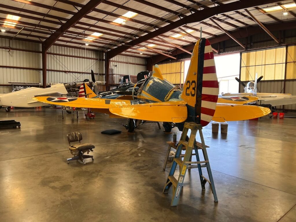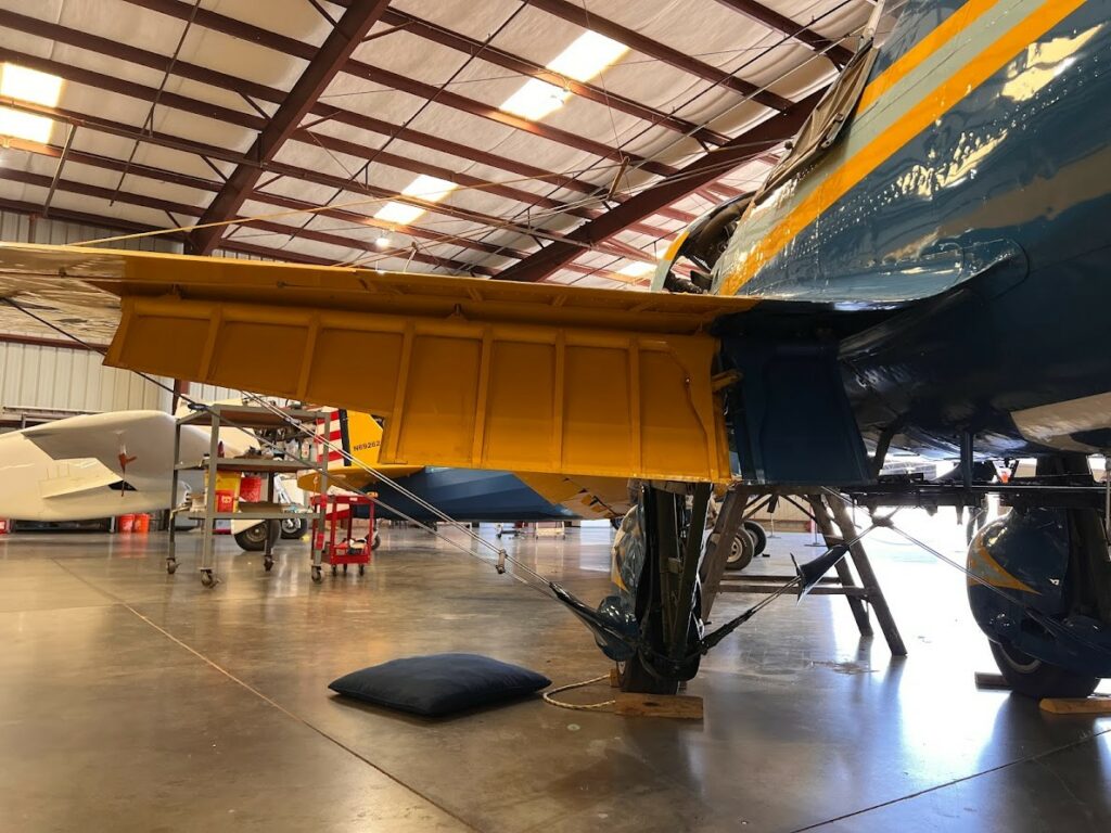 In the spring of 1962, WW2/Korean War ace Walker “Bud” Mahurin, who was also a pilot for The Air Museum, spearheaded efforts to restore the aircraft to airworthiness in time for the Air Force’s Gunnery Meet and Air Power Demonstration at Indian Springs Air Force Auxiliary Field (now Creech Air Force Base), 45 miles northwest of Las Vegas, Nevada. Since Mahurin worked for Autonetics, a division of North American Aviation, he was able to arrange for the aircraft to be brought to Autonetics’ Flight Test Facility at Los Angeles International Airport for a complete overhaul to be restored to flight, which was carried out by a volunteer team. The team was also able to secure a sponsorship from Pratt & Whitney to fund the rebuild of the R-1340 radial engine, which was done by Aviation Power Supply in Burbank, while the volunteer team scrounged to find as many replacement parts as they could bring to LAX.