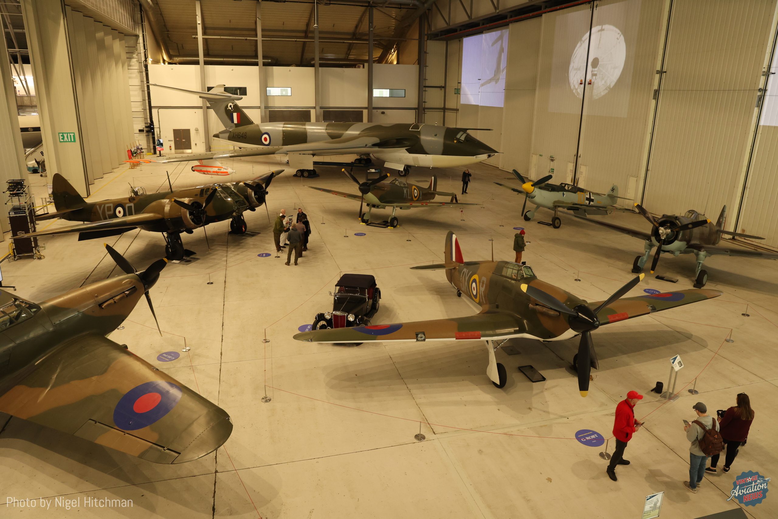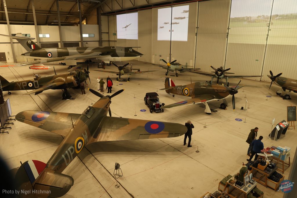 The exhibition features seven aircraft that represent those flown during the summer of 1940 in Great Britain and France, with two Spitfire Mk.1a, two Hurricane 1s, a Bristol Bolingbroke restored to represent a Blenheim night fighter, and a French AF Curtiss Hawk 75, together with their adversary Messerschmitt Bf109, represented by a Hispano Buchon. There are also films projected onto the hangar doors including scenes from The Battle of Britain which was filmed at Duxford, and other memorabilia displayed. Guided tours and sitting in the Spitfire Mk.1a are available for extra cost. Unfortunately the lighting is mostly turned off to allow the films to be watched, but they do have certain days when the lighting is turned up between 3pm and 4pm for better photographs, although that didn’t help me as I needed to leave by 3pm to fly home before dark! The aircraft featured are: