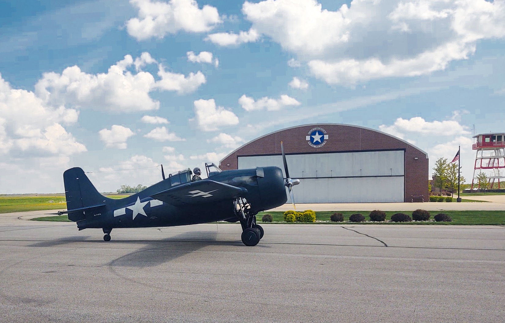 Built in Seville, Spain in 1959, this Hispano Aviación HA-1112 M1L Buchón entered Spanish AF service but was sold at auction in 1968, one of 22 Buchons bought by Spitfire Productions for The Battle of Britain film, registered G-AWHK. It was one of the 11 taken by Connie Edwards in Lieu of payment for film work and went to his ranch in Texas, where it was only flown briefly and then put on static display. It was bought by the Old Flying Machine Company in 1996 and returned to Duxford for a short time before being sold to Robert Fleming/The Real Aeroplane Company at Breighton where it was completely restored and returned to flight in May 2006 as G-BWUE. Later that year it was sold back to Spitfire Ltd at Duxford and has remained based at Duxford ever since reverting to G-AWHK and more recently painted back in its Battle of Britain film colors, although it has worn a number of other temporary schemes representing Messerschmitt Bf109s for filming. Here it represents the enemy Bf019E that the others are scrambling against.