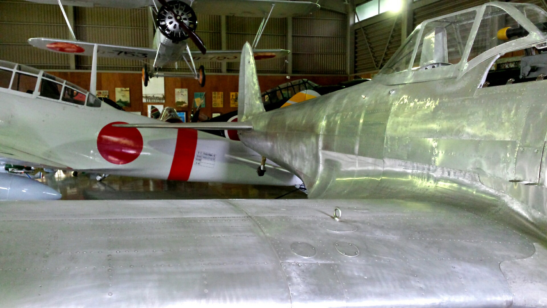 Other aircraft on display include replicas of the 1903 Wright Flyer, a Yokosuka E5Y biplane trainer (Allied reporting name “Willow”), and a Yokosuka MXY-7 Ohka kamikaze rocket, along with several post-WWII designs displayed outdoors. Many of these are aircraft that were once part of the Japan Air Self Defense Force (JASDF), such as a Curtiss C-46 Commando, North American F-86F Sabre, Lockheed T-33 trainer, forward section of a Grumman S2F Tracker, fuselage of a Sikorsky H-19 helicopter, North American T-6 Texan, and Lockheed F-104 Starfighter, with other aircraft held in storage.