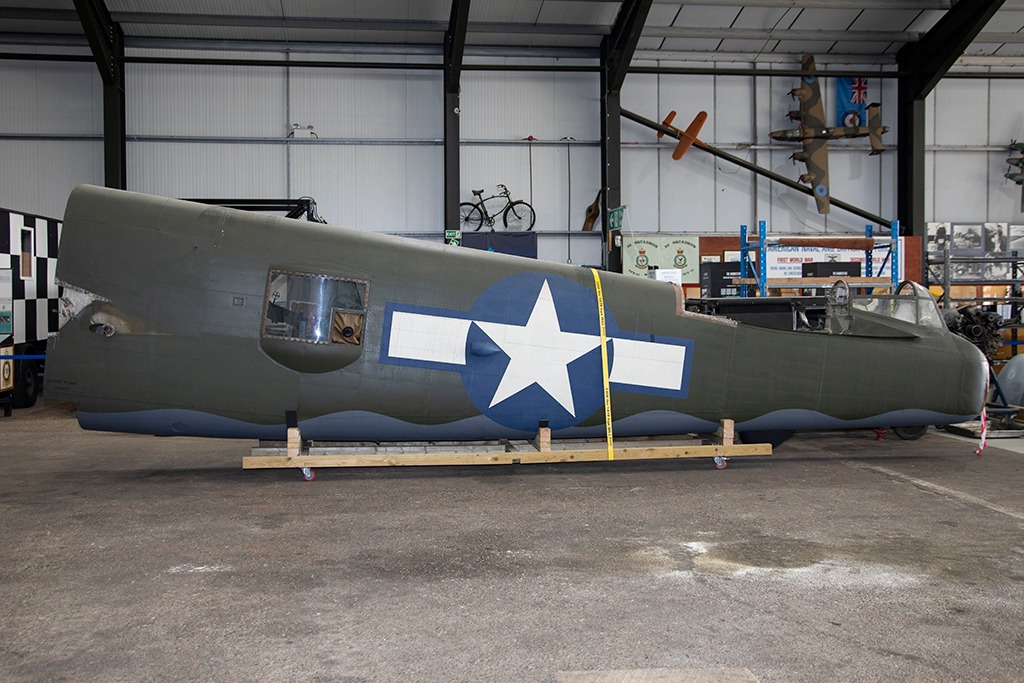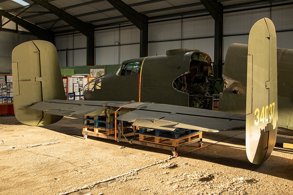 The Mitchell’s rear fuselage, safely inside the hangar at East Kirkby. (Photo via Lincolnshire Aviation Heritage Centre