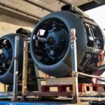 The B-25’s Wright R-2600 engines, complete with cowlings, sitting on pallets in the hangar at East Kirkby. (Photo via Lincolnshire Aviation Heritage Centre)
