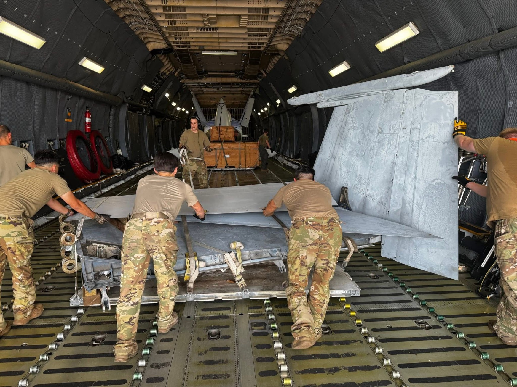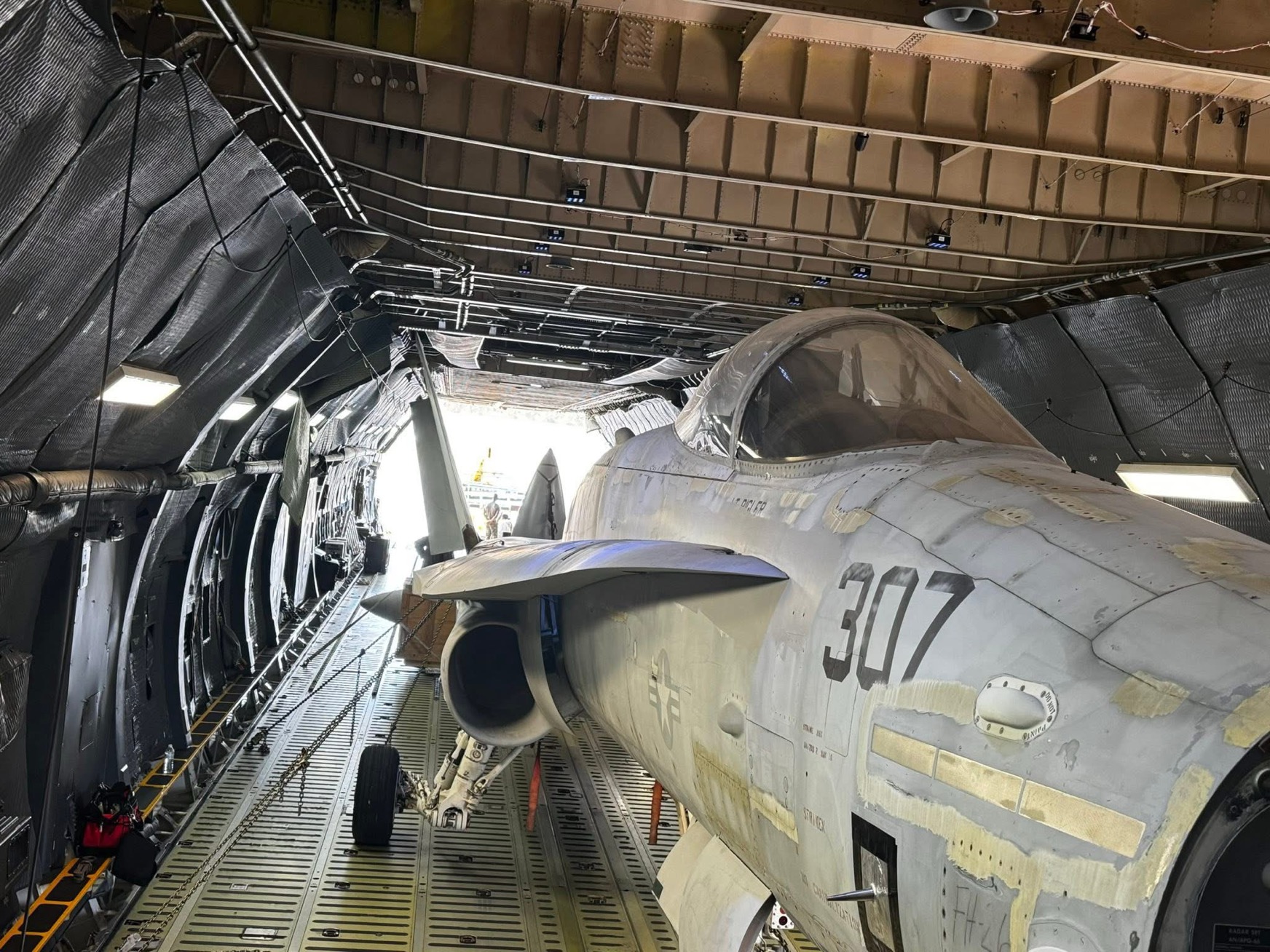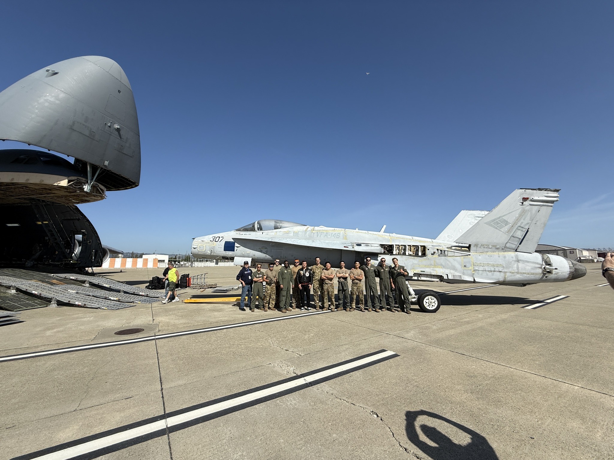 At the end of March 2025, Worldwide Aircraft Recovery, known for transporting historic aircraft across the United States, made their latest trip to Pensacola to help send the museum’s Consolidated PBY-5A Catalina to the Air Zoo in Kalamazoo, Michigan, for an extensive restoration. Yet as the Catalina embarked on its journey north, Worldwide Aircraft was contracted to prepare F/A-18C Hornet 163502 for its own journey. This time, the National Naval Aviation Museum made arrangements to have the MiG Killer Hornet shipped to the USS Hornet Sea Air and Space Museum in Alameda, California. Instead of being trucked from Florida to California, the specialists of Worldwide Aircraft Recovery helped load Hornet 163502 into the cargo hold of a US Air Force Lockheed C-5M Super Galaxy transport (Air Force serial number 86-6016), which flew the aircraft from Naval Air Station Pensacola to Oakland International Airport, just seven miles from the USS Hornet and an hour south of the Super Galaxy’s home base at Travis Air Force Base, California.