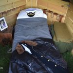 For those of us who spent three days on the grounds, camped out on wartime cots beneath a hot canvas, the show was an absolute triumph. Living history is a deep and abiding passion for each of us who take part in these events, and we always look forward to being able to tell the stories of the men and women our groups represent. Speaking for our group, we recognize there is a lot of responsibility in representing such a storied unit as the Jolly Rogers, particularly when that squadron is still on active duty nearby at NAS Oceana, and we take that responsibility very seriously. I have combed through unit War Diaries and ACA (Air Combat Action) Reports from November 1943 through May 1944 for COMAIRSOLS (Commander, Air – Solomons) looking not just for reports from VF-17, but from other units co-located at Torokina on the west coast of Bougainville during the first months of 1944… that included VMF-215, who supplied the ground personnel to maintain the Jolly Rogers’ Corsairs, and they did a magnificent job. I have also made the drive down to the Dare County airport at Manteo, where I made copies of the original VF-17 combat reports for January 30, 1944 – the day Ray Beacham put his Corsair in the water off of Torokina due to combat damage sustained during that day’s mission to Rabaul. I have also spent hours scouring the internet for maps of the area, and was fortunate to find scans of the original 8” x 8” target and approach maps for Rabaul itself, as well as for Lakunai, Tobera, and Vunakanau airfields produced by the N.A.C.I. Hydrographic Office. I cleaned these up, sized at 300dpi, and printed out copies for the other guys in my unit to carry along with their original Felsenthal Mark III plotting boards, which I was fortunate to find several years ago. Since I can’t afford a real wartime plotting board tray, I built a replica of one out of wood, covered in aluminum furnace tape, sprayed flat black then scraped and knocked around to look like the real thing. I also hand-painted a copy of the sign which hung over the VF-17 ops shack door at Ondongo on their first tour in November/December ’43, to hang out in front of our own “ops shack”- a 10’ x 12’ square white canvas tent, hand-sewn by our northernmost member, Joe Hannon, with framing built by our group’s “infrastructure expert”, Rob Friar.