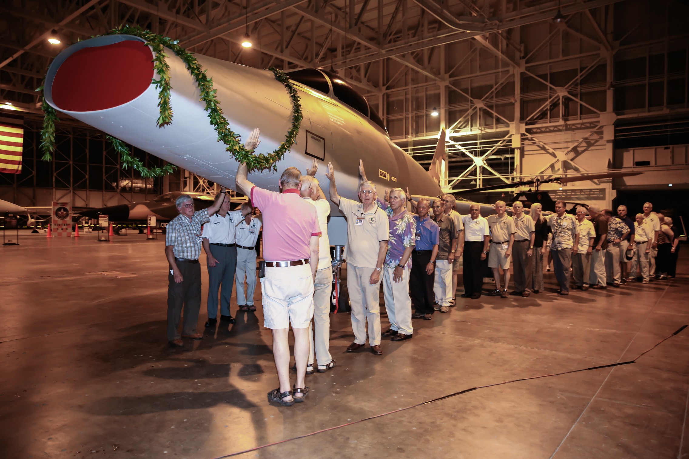 General Lori Robinson, commanding general of Pacific Air Forces, pilot Dick Rutan Misty 40, and Air Force Major General Don Shepperd, Misty37 were among the guest speakers. Hawaiian Kahu Kordell Kekoa gave a very moving Hawaiian blessing of the aircraft, with all 30 pilots in attendance and participating, along with Col Day’s wife Doris and Col Veach’s sister Diana Barcena all holding a part of the aircraft, placing their hands on the plane, with specially blessed Hawaiian waters. A large ceremonial maile lei was draped on the aircraft.