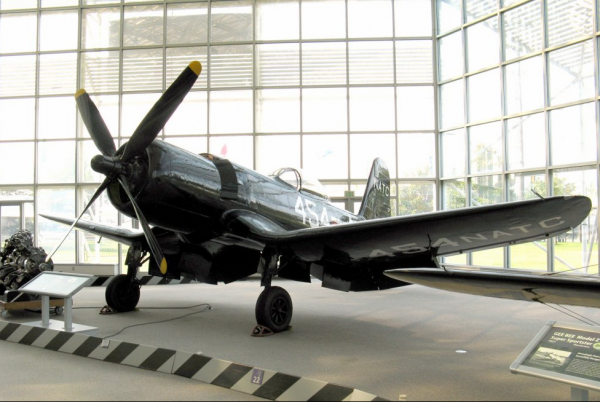 In the early 1960s Navy title passed to the Marine Corps Museum at Quantico, Virginia. Following display aboard the aircraft carrier Intrepid during New York’s bicentennial observance in 1976, the F2G was barged back to Norfolk. Subsequently, the museum traded the Corsair and a Douglas Skyraider to Doug Champlin in exchange for a Dauntless dive bomber. Champlin kept the Corsair at Enid, Oklahoma, until he opened his museum in Mesa, Arizona, in 1981, when former Thompson Trophy racer Ron Puckett flew the F2G to Falcon Field. Subsequently the rare Corsair came to Seattle with the rest of the Champlin collection in 2003.