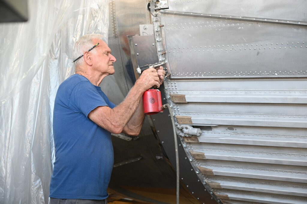 There are many many large air and space items restored for the NMUSAF inside the hangars at Wright Field, but occasionally a project such as the Atlas requires specialized assistance offsite from Dayton, and thus the Atlas was moved by road to Thomarios, a painting company in Copley, just outside Akron and some 200 miles northeast of Dayton.