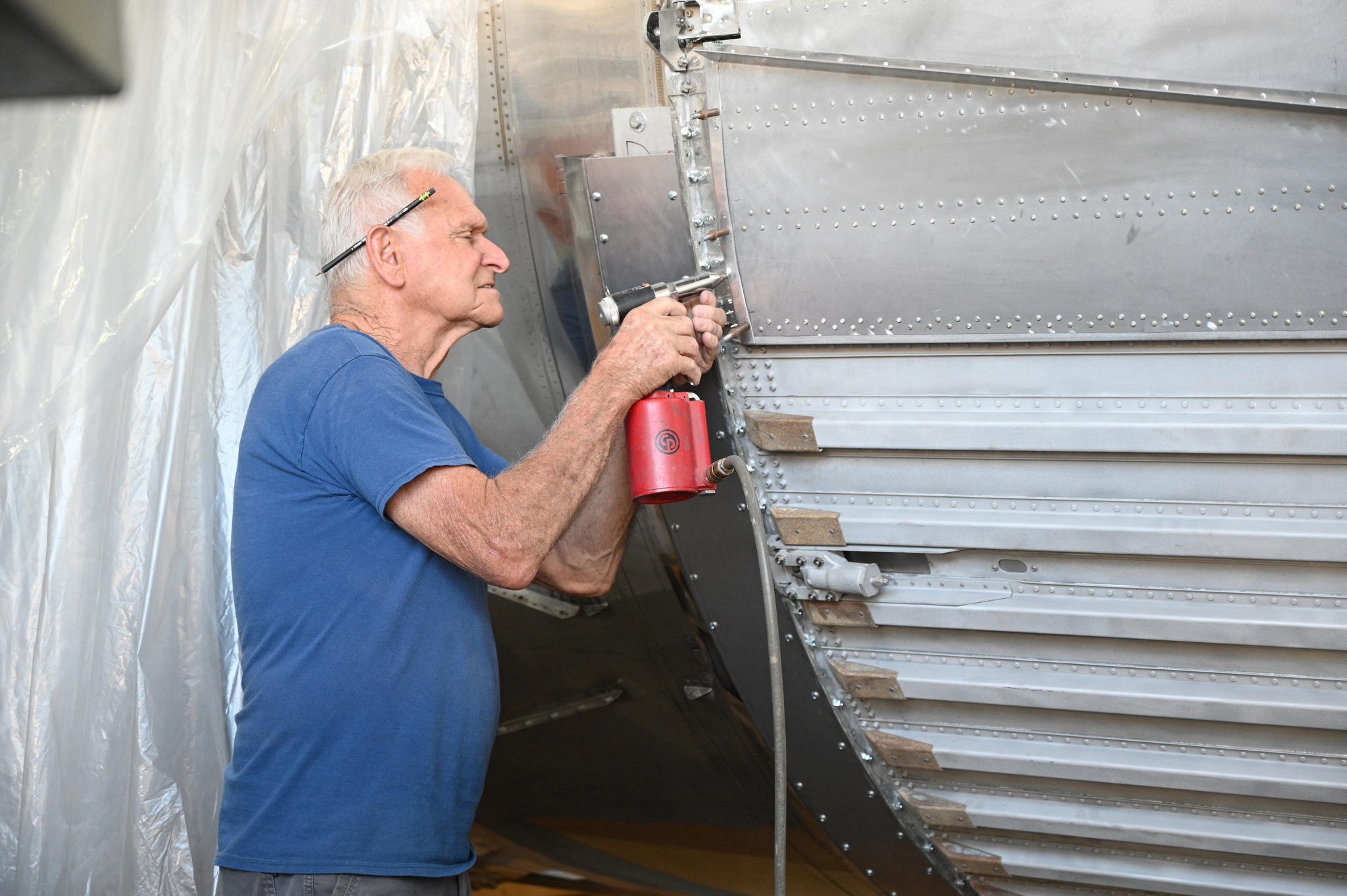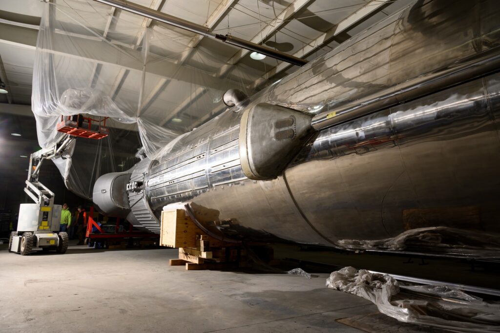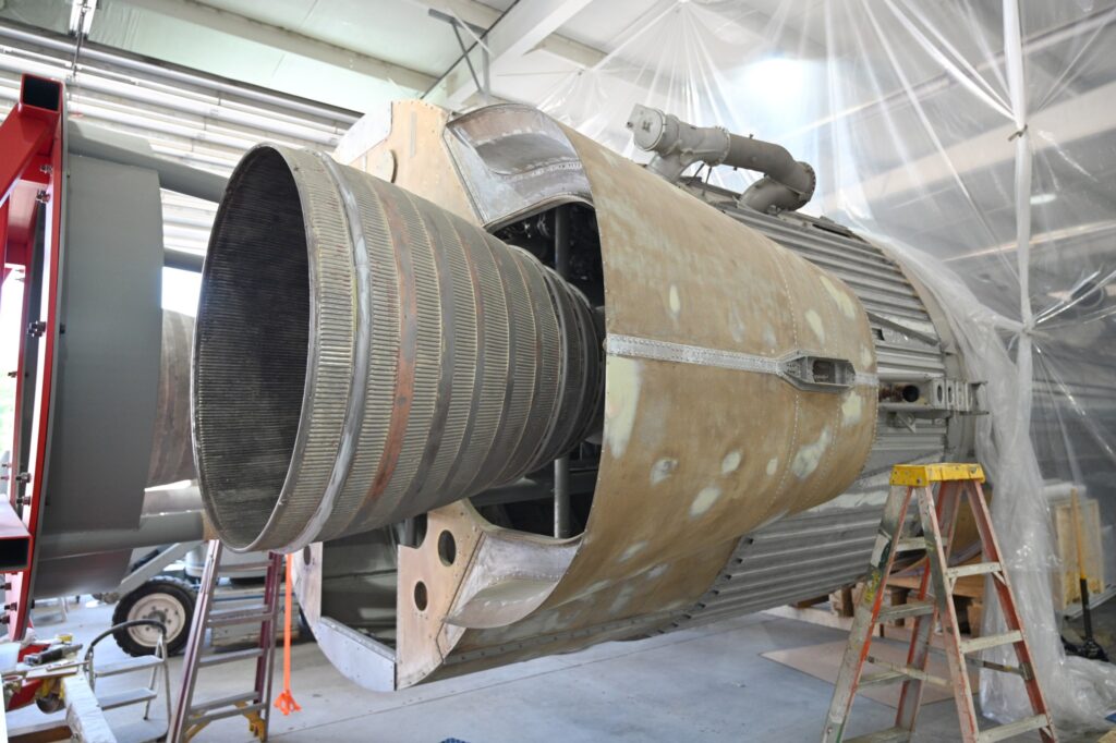 Thomarios specializes in several areas of museum restoration, including the static restoration of aircraft and rockets, having worked with organizations from the Intrepid Museum in New York City, to the Kennedy Space Center in Florida, where they restored the Kennedy Space Center’s Saturn V rocket. Much of the work at Copley involved strengthening the internal structure, replacing corroded rivets, and polishing and repainting all surfaces for display. On April 22nd, with the work on the Atlas being completed, the mighty missile rolled down the interstate back to the NMUSAF where it was moved into the museum’s Missile Gallery the following day on April 23rd. The Missile Gallery was due to be closed for the day on April 29th for the Atlas to be mounted vertically.