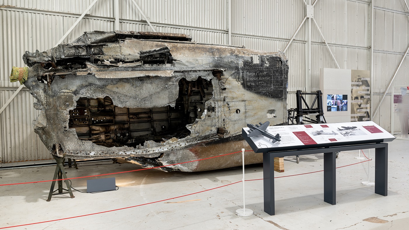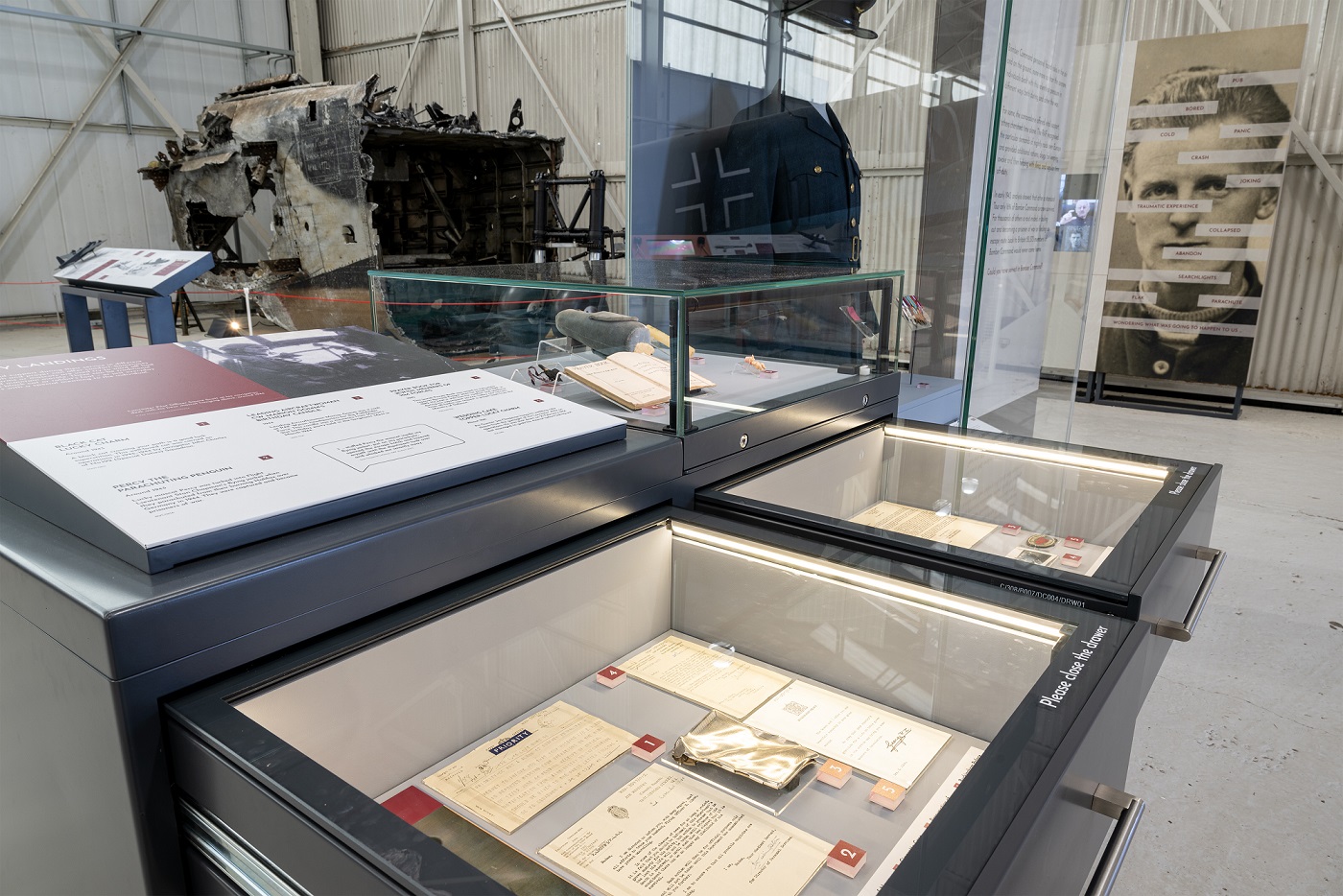At the center of the new exhibition is the Wellington B Mk X bomber, one of only two remaining examples, and on display for the first time in the Midlands after more than a decade of conservation work. The Wellington was widely used as a night bomber in the early years of the Second World War, and by 1942 Wellingtons were the most numerous aircraft in Bomber Command. They began to be replaced by more capable four-engined heavy bombers such as Halifaxes and Lancasters but continued to operate with Bomber Command as a training aircraft. The Wellington’s rear turret is displayed alongside the aircraft, allowing visitors to peer inside the fuselage and view its famous geodetic structure designed by Barnes Wallis. Interactive displays around the Wellington focus on the roles of the five-strong crew, their extraordinary service, and the close bonds they developed when flying together.