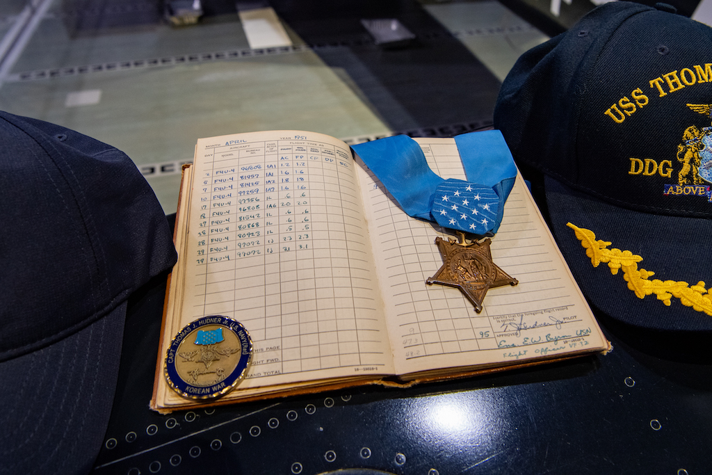 Members of the Hudner and Brown families were at the museum as part of the formal dedication of the display, including Thomas Hudner III, son of Thomas Hudner, and Jamal Knight, grandson of Jesse Brown. They also loaned personal memorabilia that adds to the authenticity of the exhibit.