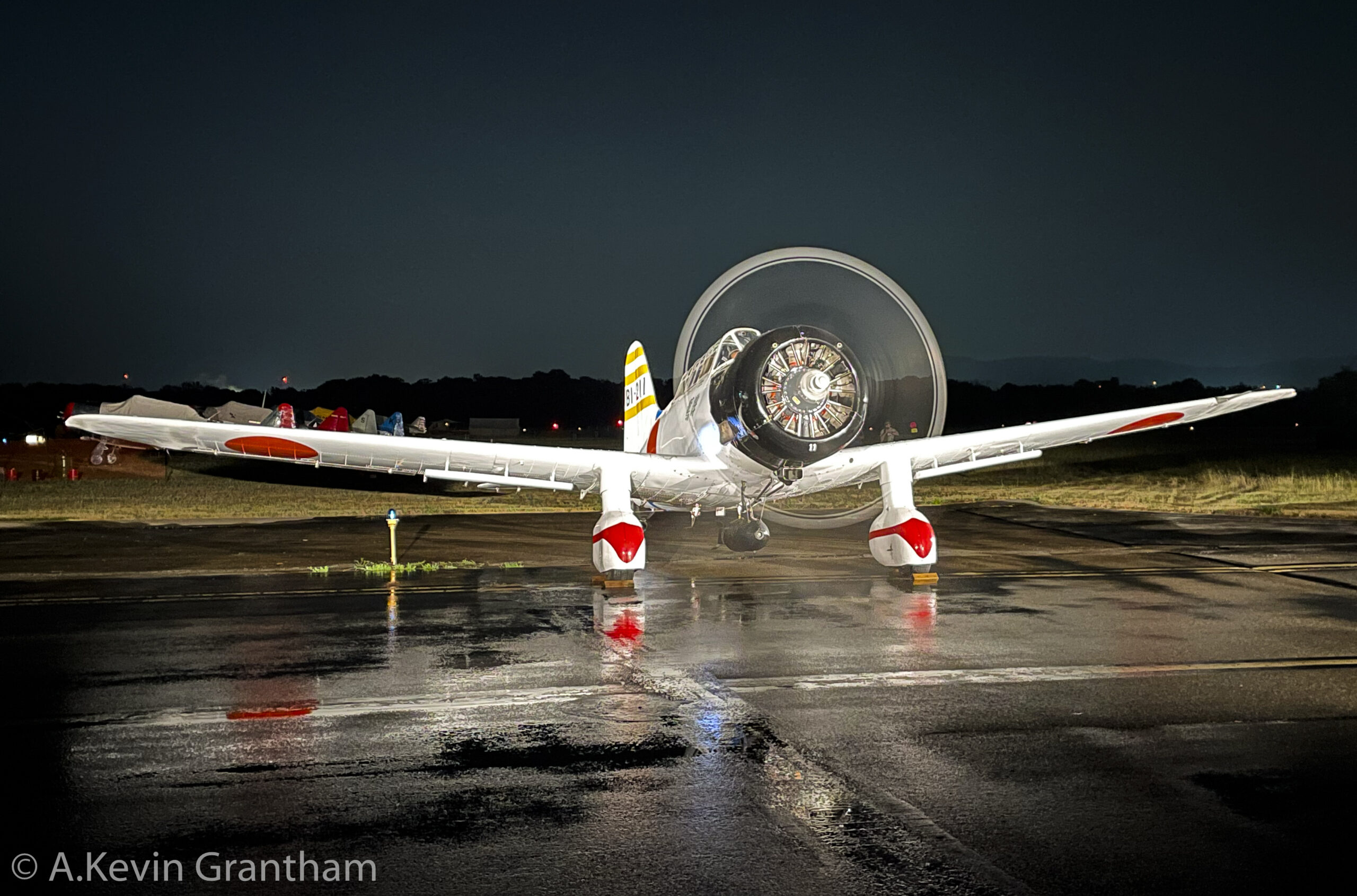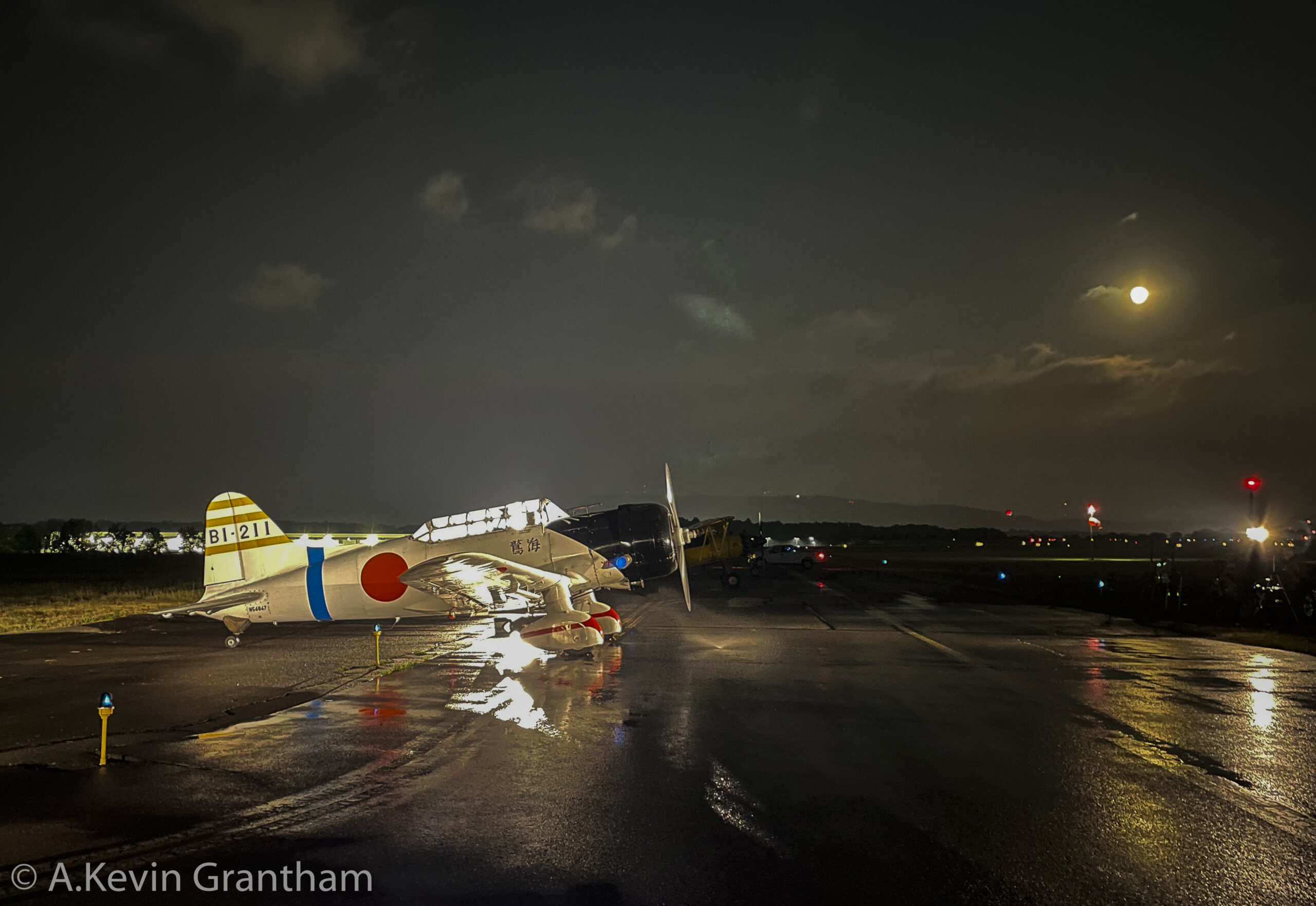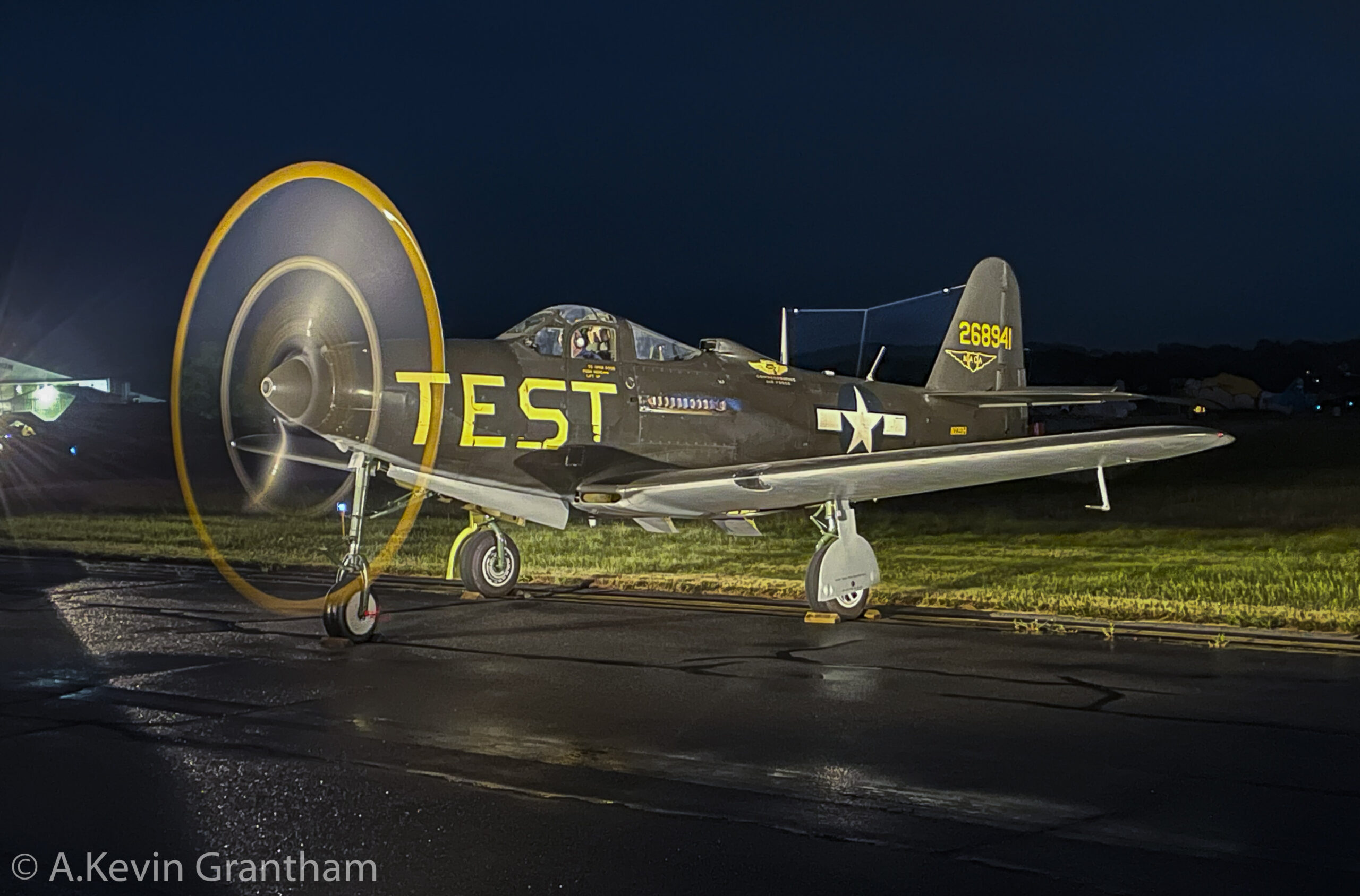 ‘Val’ under moonlight in Reading, Pennsylvania. Note the water vortex whirling in front of the aircraft during the engine run. (photo by A.Kevin Grantham)