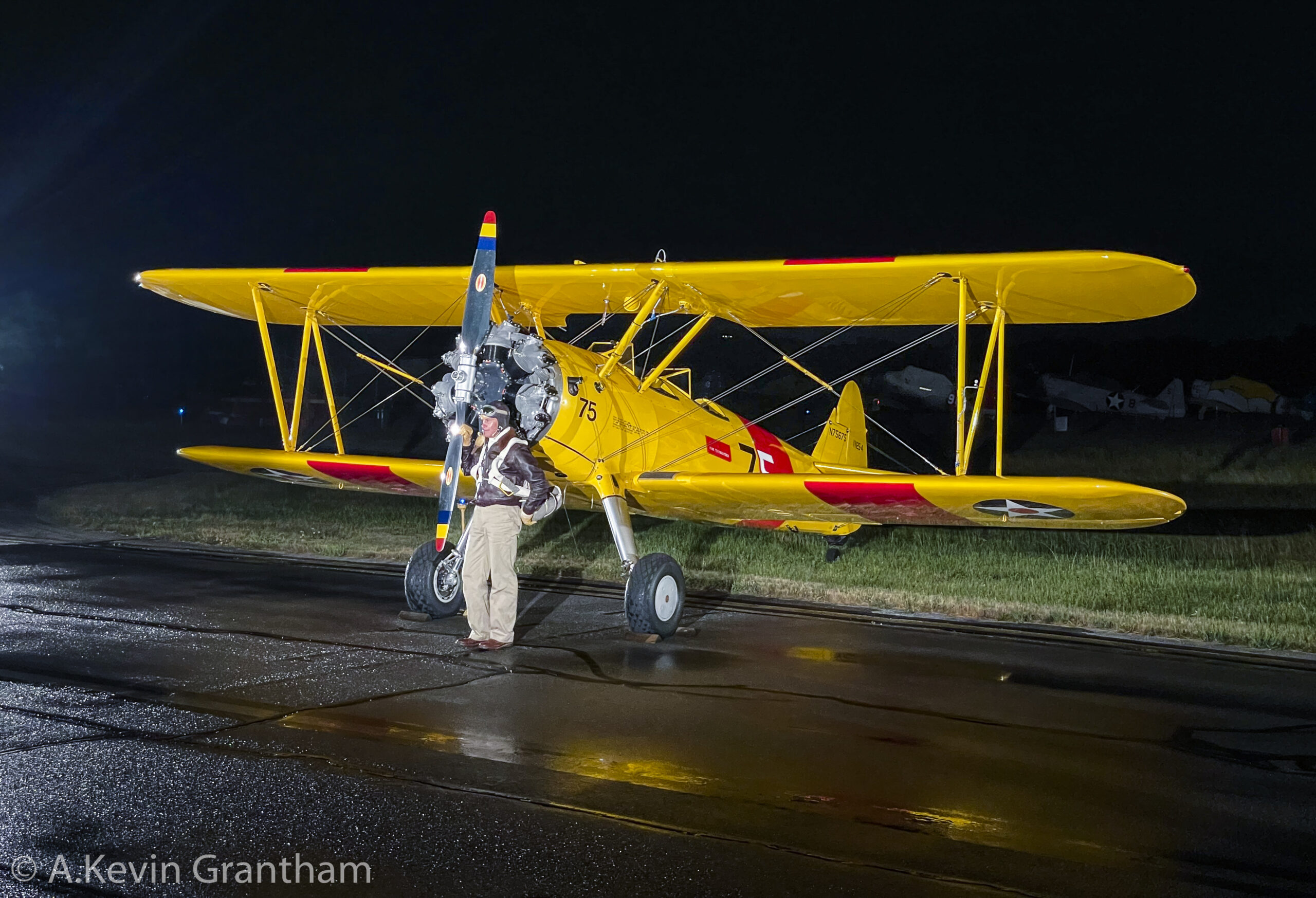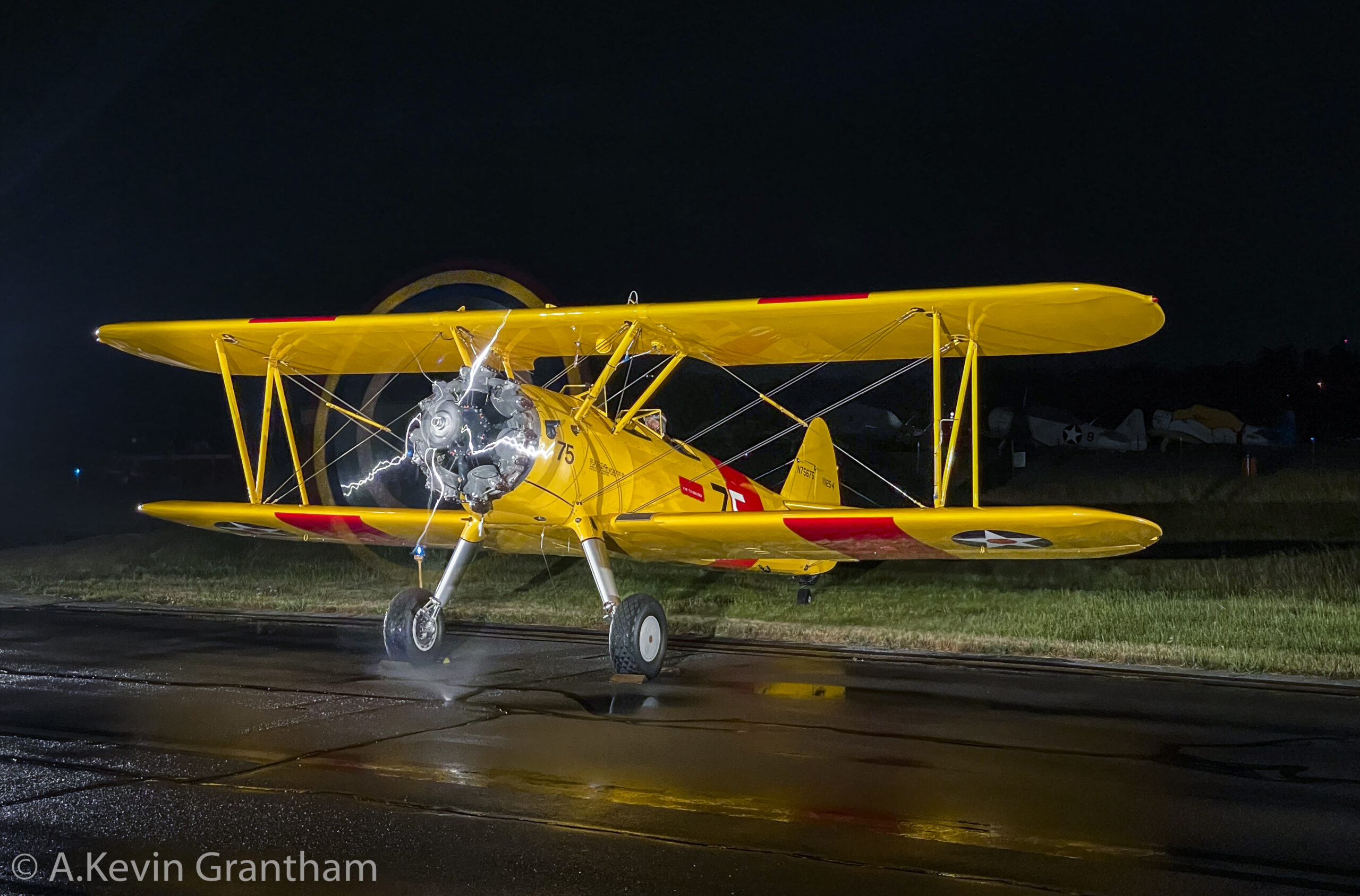 Kappler Christian’s Boeing N2S-5 Kaydet.(N75675). During WWII, this aircraft served in the U.S. Navy as BuNo.61041. Note the propeller-generated air vortex is sucking up water from the tarmac just beneath the engine! (photo by A.Kevin Grantham)