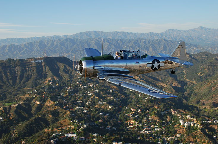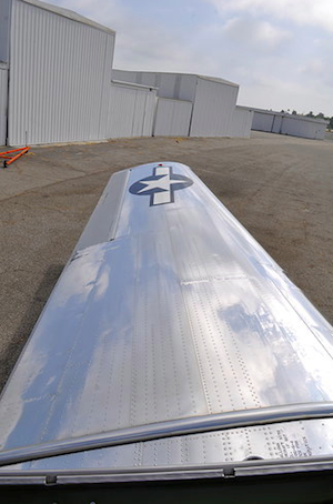 SNJ-6 N45CK in flight over Hollywood, California. (Image Credit: Platinum Fighter Sales)SNJ-6’s wing, re-sparred, re-skinned and undoubtably better than new. (Image Credit: Platinum Fighter Sales)The museum’s latest addition, North American SNJ-6 N45CK, left the production line in 1960 and had been previously restored, when in June of 2006, it struck power lines near American Falls, Idaho. According to the NTSB Accident Report, the plane, which was enroute to Jerome, Idaho from Afton, Wyoming, when the pilot found it too cold at his cruising altitude of 8500′ MSL, so he descended to warmer altitudes, following the path of Snake River, cruising “about 100 feet” above its surface. According to the report, while following along the river, he noticed three wooden poles and a crossbeam located along the edge of the river, and though he claims he did not see wires, he “made the immediate assumption that there were wires.” He pulled up and heard a loud bang as the airplane struck the transmission lines. He also saw a blue flash. After determining that the airplane was “able to continue safe flight,” he made the decision to proceed to his planned destination, where he was able to make a normal landing.