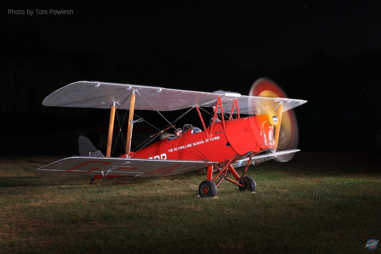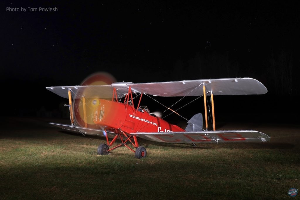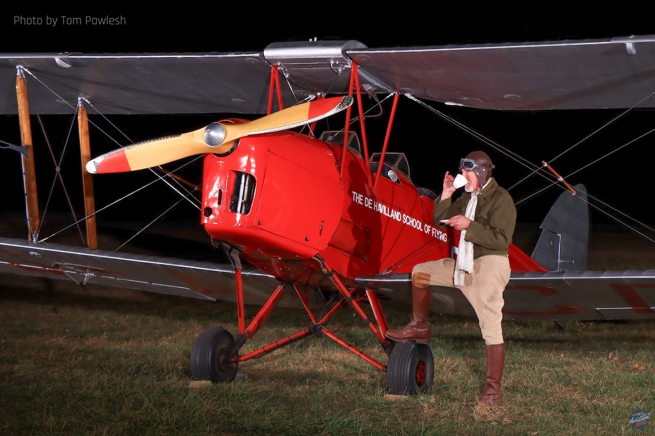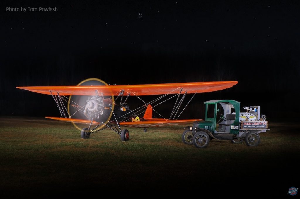 We photographed a “flight instructor” from the De Havilland School of Flying having a spot of tea before his student arrived for his flying lesson.The bright red Tiger Moth made for some stunning night photos. The 1927 Stinson SM-1 Detroiter was our next subject, its passengers arrived in luxury in a 1927 Chandler Phaeton. Our last scene was a 1929 New Standard D-25 being serviced by a 1925 Ford Model T fuel truck.