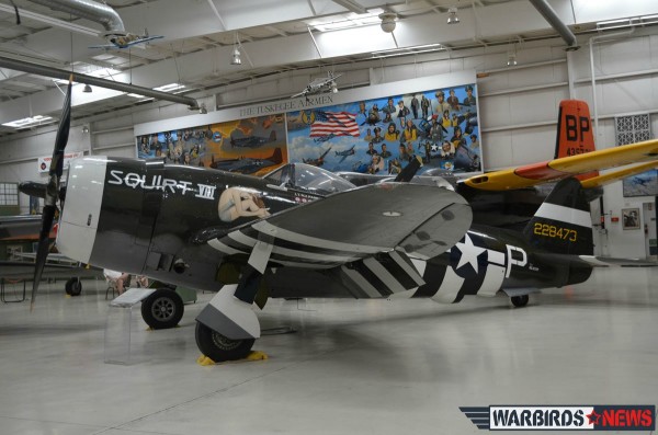 The example on display at PSAM was constructed as a P-47D-40-RA by Republic at Evansville, Indiana with the serial number 45-49205 and in 1945 the aircraft was transferred to Oklahoma Air Material Area, Tinker AFB, Oklahoma City, OK. In 1947 this Thunderbolt was taken on strength with the now-renamed United States Air Force and the following year was redesignated as an F-47D and transferred to 1708th Ferrying Group, Military Air Transport Service, Kelly Field, San Antonio, TX. It served with that unit until 1953 when it joined the Fuerza Aerea del Peru (Peruvian Air Force), initially with the serial 547 and later as 122 FAPe. In 1969 it was acquired by Ed Jurist’s Vintage Aircraft International Ltd of Nyack, NY and transported by ship back to Brownsville, TX on the SS Rosaldina. The aircraft was then reassembled by the Confederate Air Force (now Commemorative Air Force) in Harlingen, TX and, in 1973, eventually flew once again with the civil registration N47DE. In the last forty years the aircraft changed several owners, including David Tallichet, Doug Arnold and then Stephen Grey in the UK, and back to the U.S. under Robert J. Pond until it was donated to the the Palm Springs Air Museum/Pond Warbirds LLC in 1997.