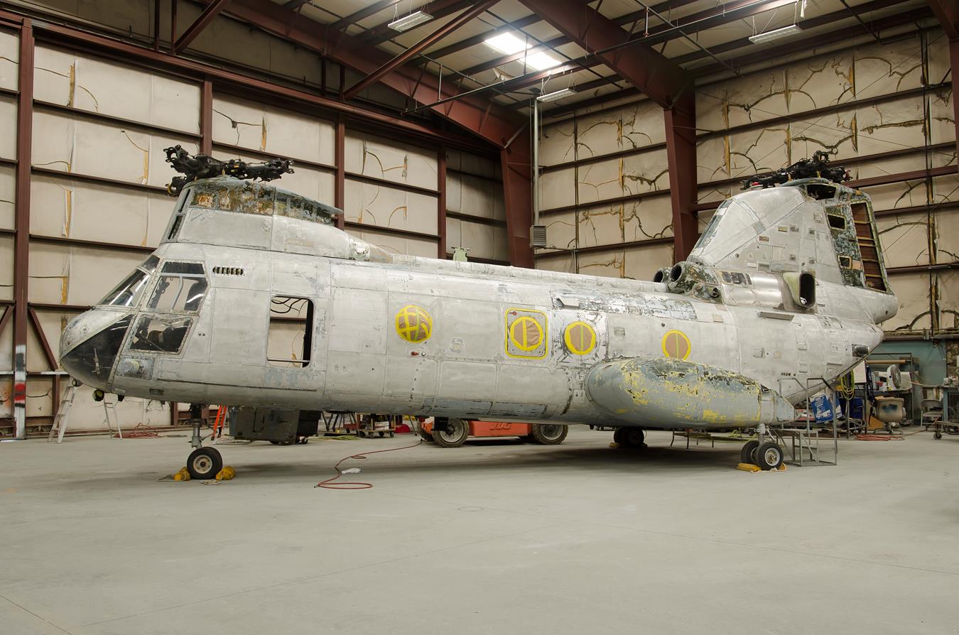 This Sea Knight actually rolled off the production line in Morton, Pennsylvania during the summer of 1969. The military formally accepted her on August 12th, 1969, and the United States Marine Corps assigned the helicopter to her first unit, HMM-261 – then known as the Bulls – just a few days later on August 15th. Her time with the Bulls was short though, as HMM-365 Blue Knights received the aircraft at their home base, MCAS New River in North Carolina, on December 10th, 1969. ‘469 left the Blue Knights on February 4th, 1971 when she joined Headquarters and Maintenance Squadron 26 (H&MS-26), also at MCAS New River. A few months later, following maintenance, she joined the Black Knights of HMM-264 on June 10th, 1971, moving quickly to HMM-263 on August 12th that year at Turner Field, MCAF Quantico, Virginia. The Sea Knight moved back to H&MS-26 for another period of maintenance on March 14th, 1974, before returning to HMM-261, now named the Raging Bulls, on May 30th that year. ‘469’s history is a little vague over the following three decades, but at some point she received an upgrade to CH-46E status. She is at least known to have been with HMM-261 during January, 2008. Her final operational squadron was HMM-163, the Ridge Runners. She went into storage at Davis-Monthan Air Force Base on September 2nd, 2010, before finally being struck off charge three months later on December 2nd. Once the Marines finally retired the remainder of their Sea Knights in 2015, their stock of mothballed aircraft at Davis-Monthan began thinning out. Pima Air & Space Museum received Bu.156469 on loan in March, 2017, when she joined the queue for refurbishment and formal display. The following gallery shows how her refurbishment progressed from this summer until today.