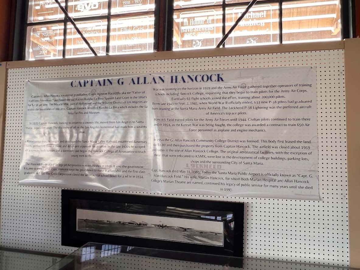 Exhibits in the museum also pay tribute to Amelia Earhart, the Tuskegee Airmen, the WASPs, and NASA’s Space Shuttle. Visitors in the Rocketeer Hangar will also find a Wright Glider replica hidden up in the rafters! Perhaps the most unusual exhibit includes the diorama and displays describing G. Allan Hancock Field, an airfield which Captain George Allan Hancock established in 1927. Hancock was extraordinarily accomplished – a Renaissance Man in every sense of the term – having spent time as an oilman, sea captain, aviator, musician, banker, philanthropist, farmer, railroad engineer, developer and scientist! Using a plot of land in Santa Maria, he established the Hancock College of Aeronautics in an effort to set up a flight school at what would become Hancock Field. Hancock also provided financial support to the now legendary Australian aviators Sir Charles Kingsford-Smith and Charles Ulm; he loaned them the Fokker F.VIIb/3m tri-motor (which became the Southern Cross) allowing them to execute the first successful flight from the United States to Australia, between May 31st and June 9th, 1928. During WWII, Hancock Field became one of eight civilian institutions which provided training to Army cadet pilots (Hancock met with General Henry “Hap” Arnold to arrange this matter).