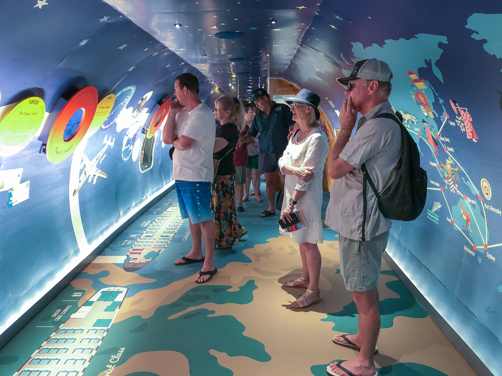 The interior display explains the history and significance of the Qantas Constellations and Super Constellations from 1947 -1963. It includes the recreation of part of a passenger cabin, multimedia screens and interpretative displays.