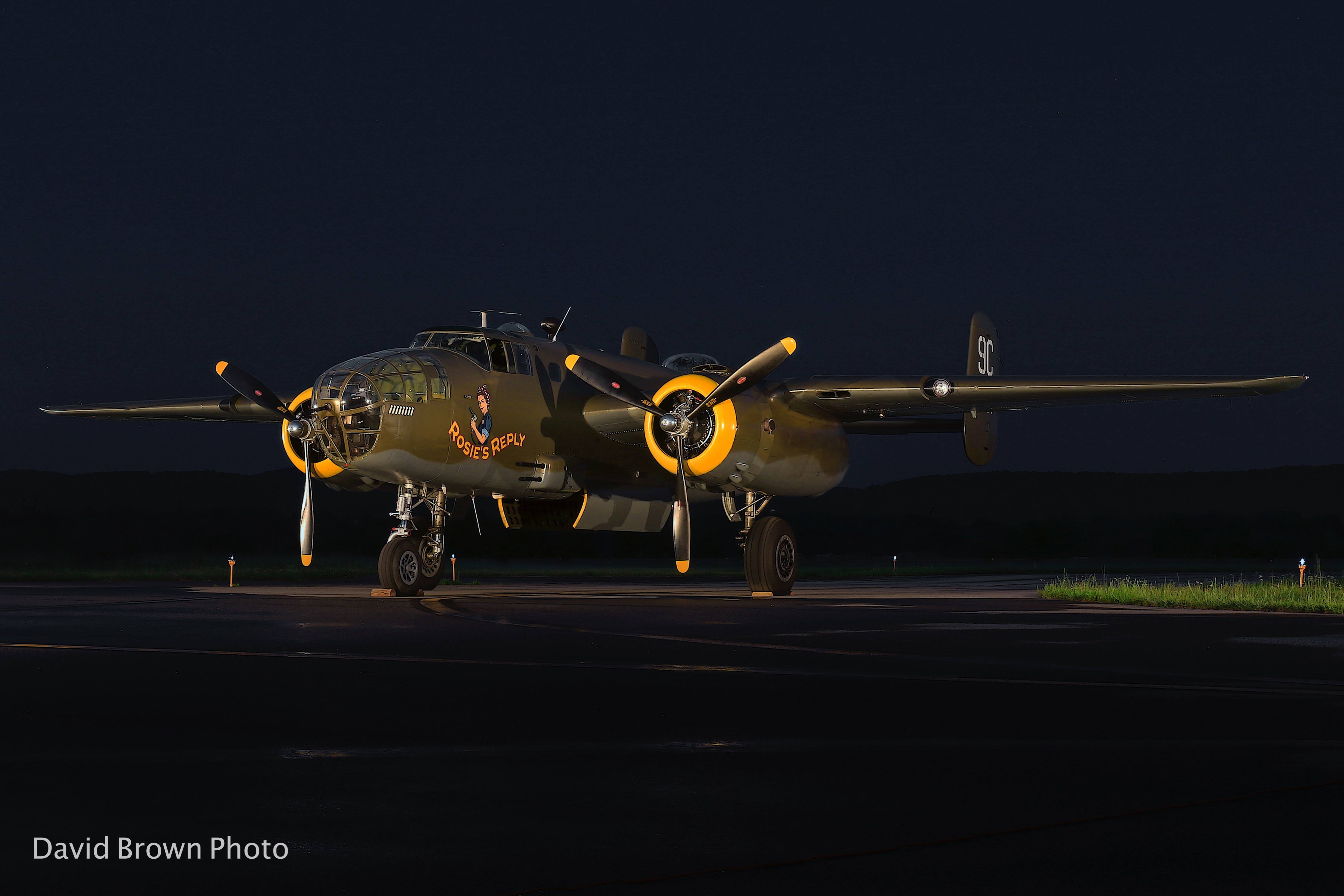 For those that wanted to keep their feet planted firmly on the ground there was a night photo shoot featuring a B-25 Mitchell Bomber, SBD Dauntless and P-51 Mustang. The lighting was provided by professional photographer Pete Lerro. Pete is very experienced at setting up themed photo shoots for aviation and railroad enthusiasts. During this specially ticketed event the ramp was soaked down by the fire department to give some nice reflections and each aircraft in turn ran their engine for ten minutes. This was plenty of time to get photos from both sides of the aircraft and a head on shot.