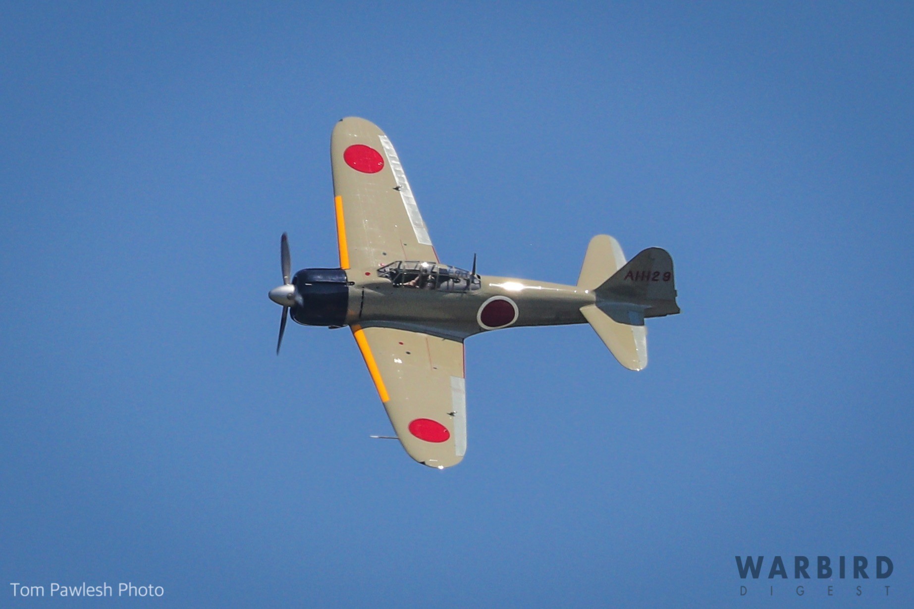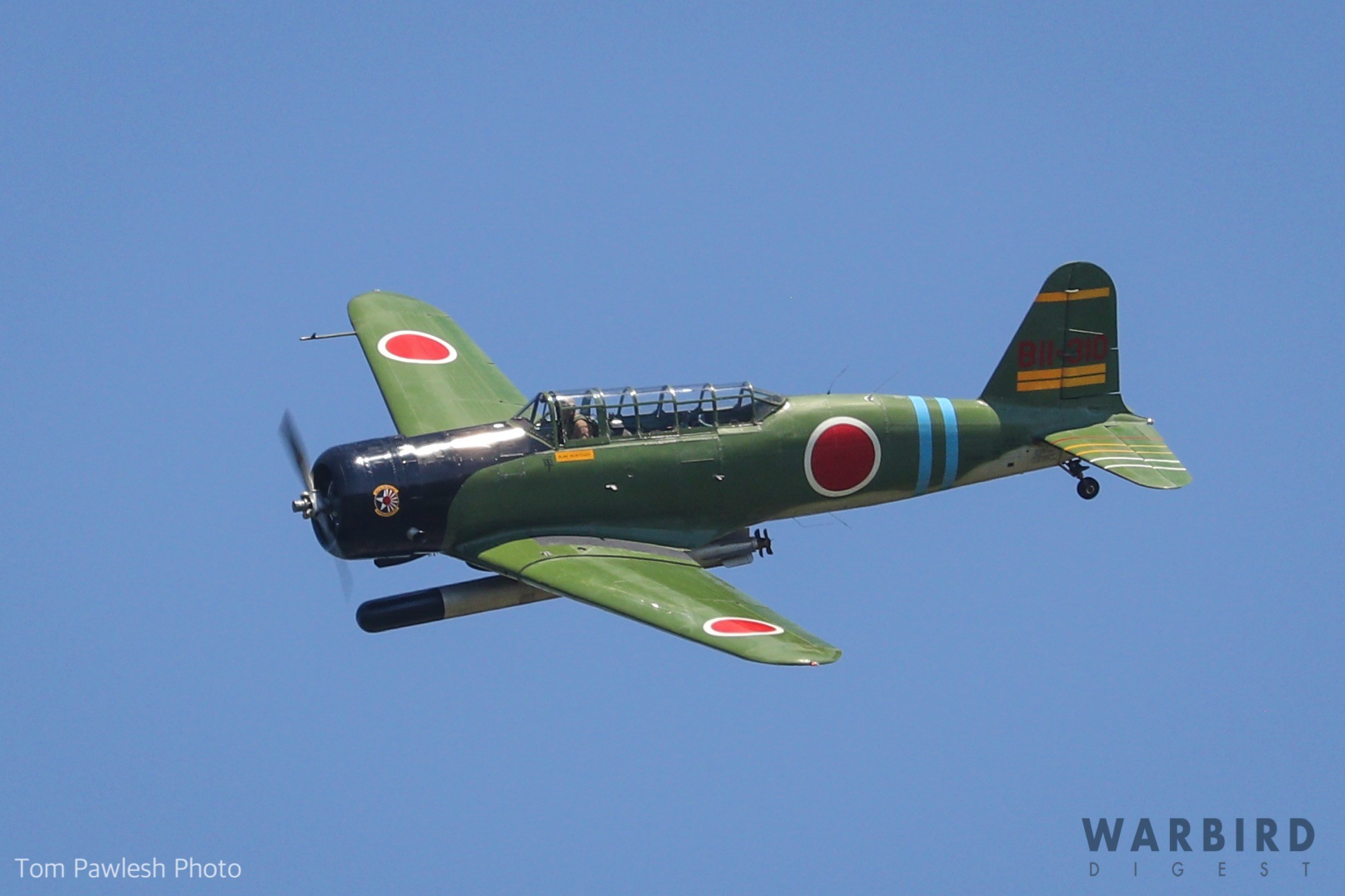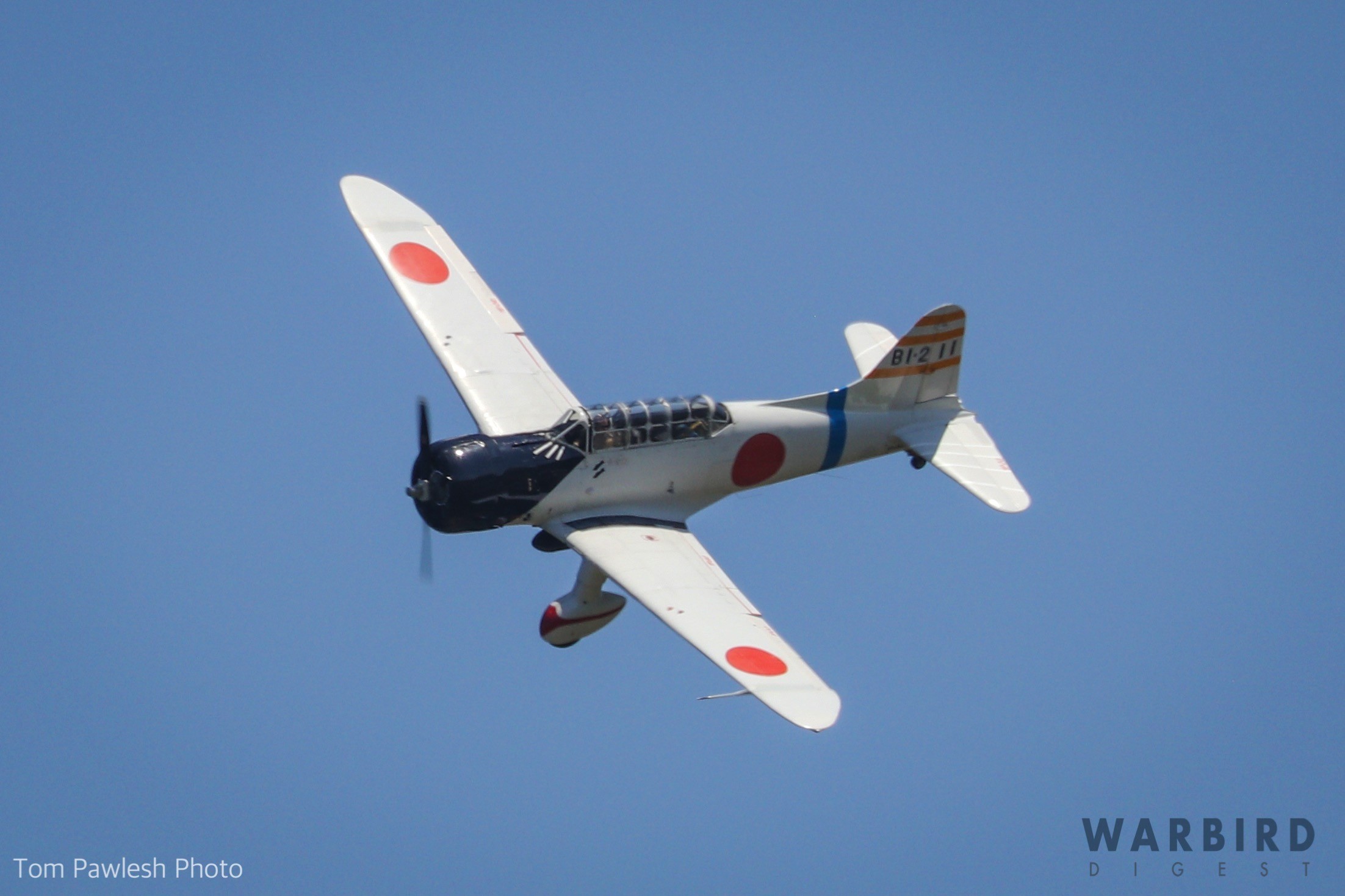 The airshow each day featured more warbirds doing fly-bys and aerobatic routines. Everything from primary trainers to L-birds to fighters to transport and heavy bombers were in the air during the afternoon. Aerobatic routines were flown by Kevin Russo in the SNJ, John Current in the CAF Airbase Georgia’s FG-1D Corsair, Mark Todd in the P-63 Kingcobra and Craig Hutain in the P-51 Mustang. Mark Murphy flew a nice routine in the rare Mitsubishi A6M2 Model 21 Zero.